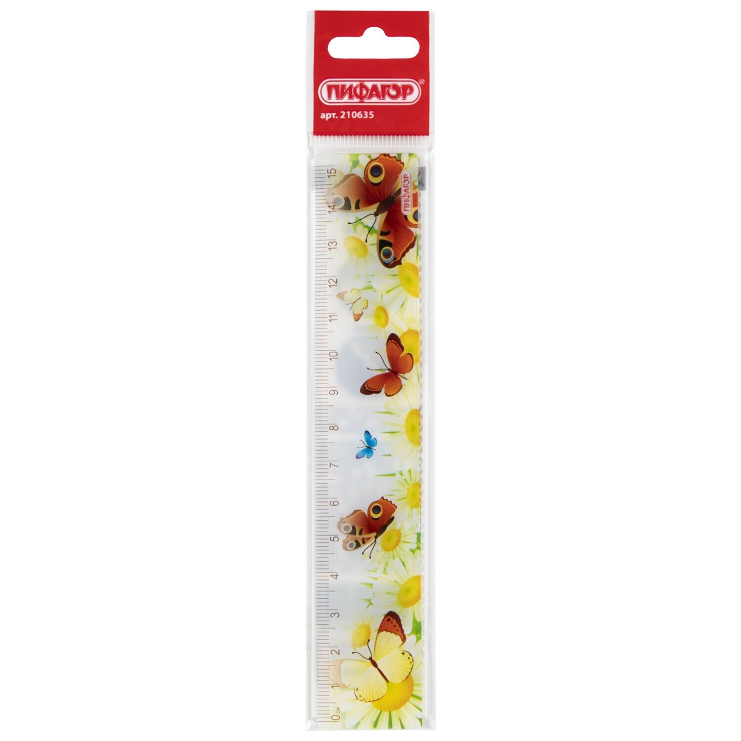 Линейка Пифагор пластиковая 15 см, "Бабочки", цветная печать, с волнистым краем, европодвес, 210635 информация: