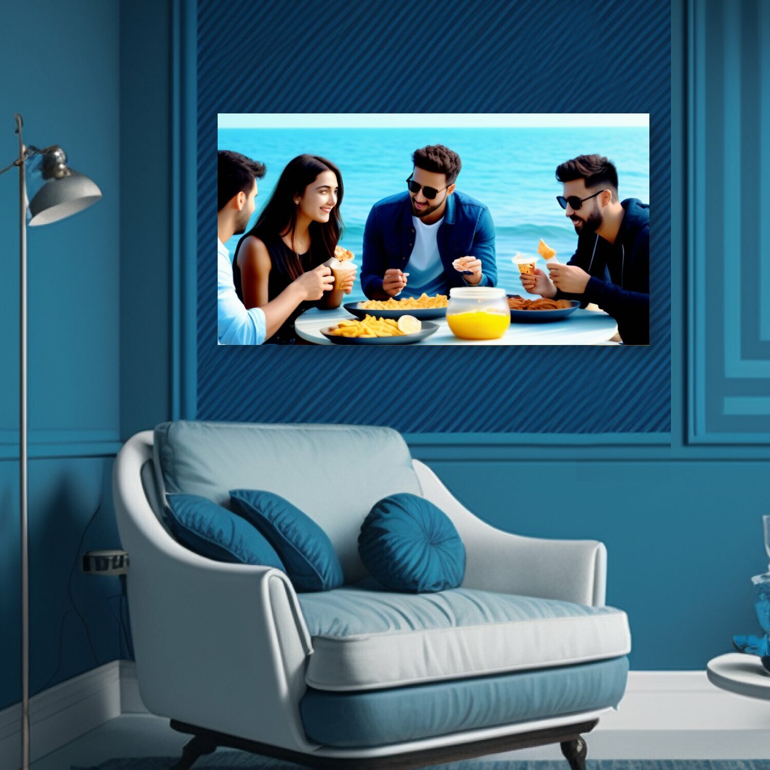 Картина на холсте "Группа друзей, наслаждающихся закусками у моря" на подрамнике 175х75 см. для интерьера 5 940 ₽