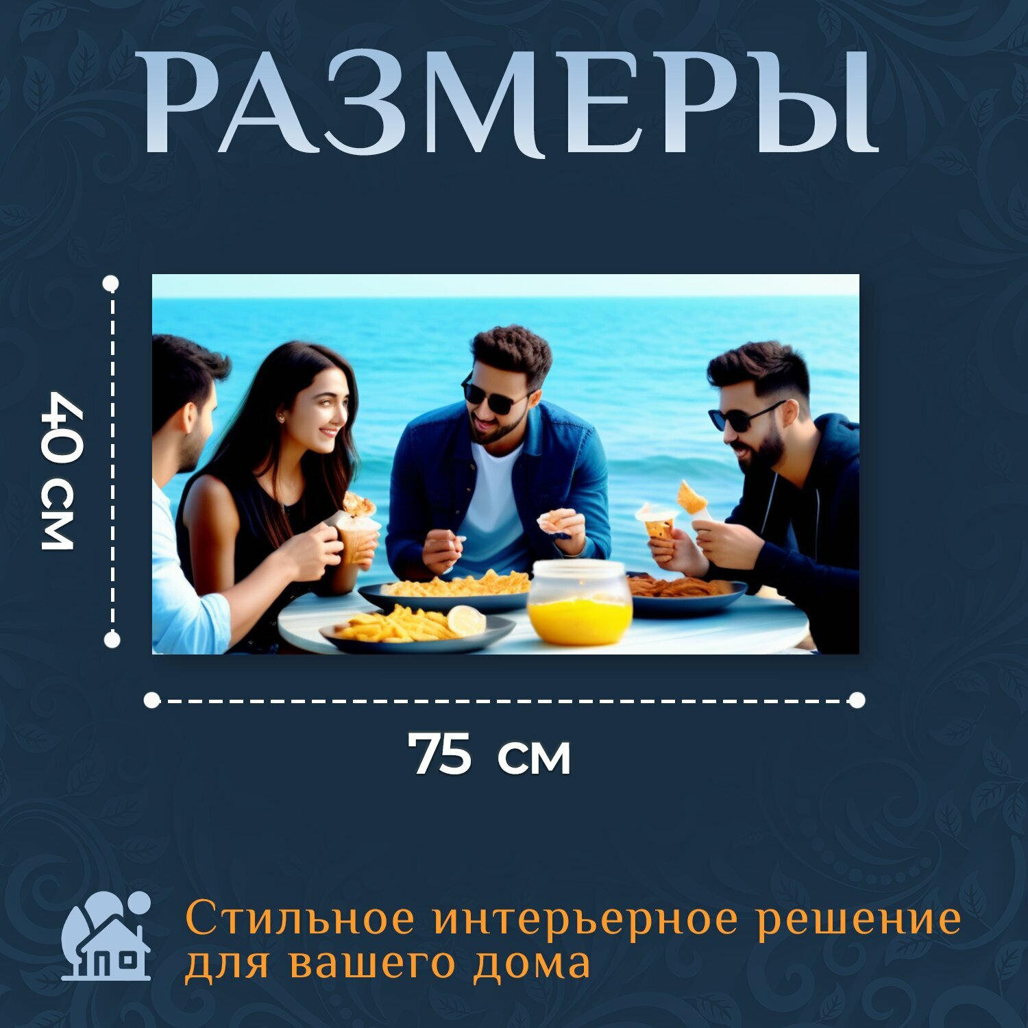 Картина на холсте "Группа друзей, наслаждающихся закусками у моря" на подрамнике 75х40 см. для интерьера информация: