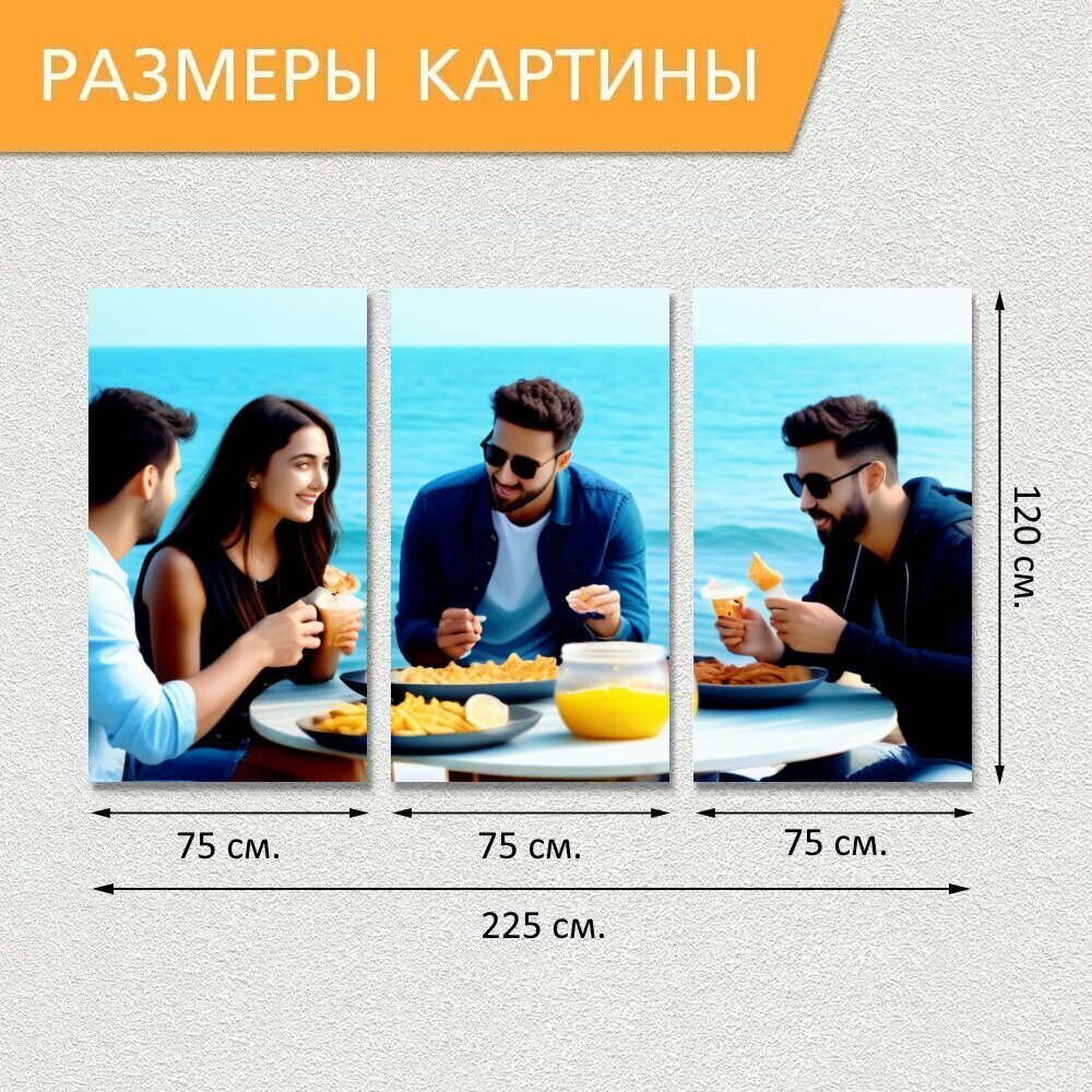 10 цен на Модульная картина на холсте "Группа друзей, наслаждающихся закусками у моря" триптих на подрамнике 225х120 см. для интерьера