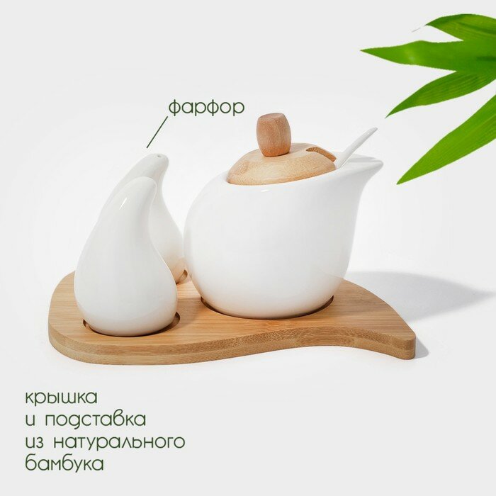 10 цен на Набор фарфоровый для специй на бамбуковой подставке BellaTenero «Капельки», 3 предмета: солонка 60 мл, перечница 60 мл, сахарница с ложкой 330 мл, цвет белый