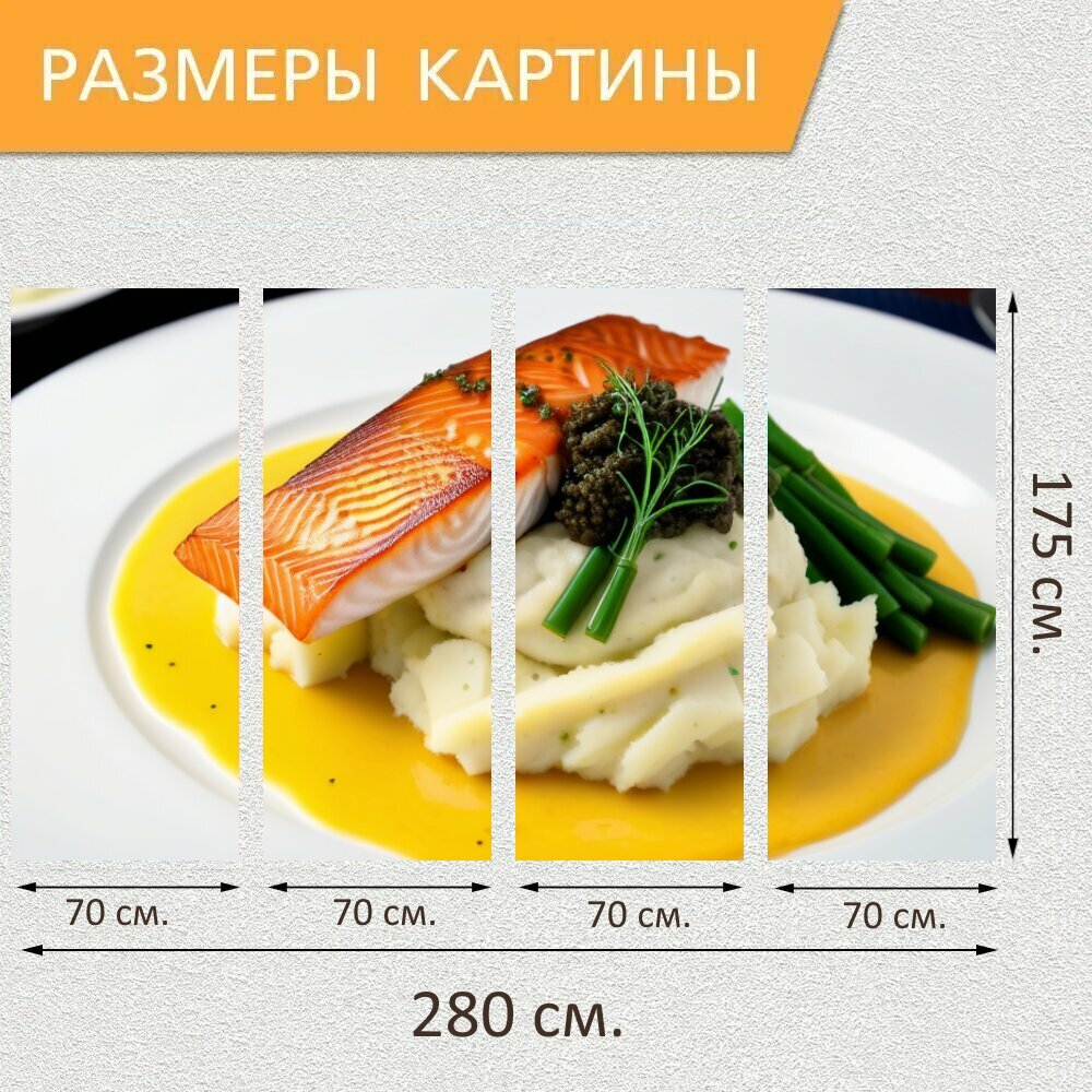 Модульная картина на холсте в кафе "Ужин с рыбой и картофельным пюре , " триптих на подрамнике 280х175 см. для интерьера информация:
