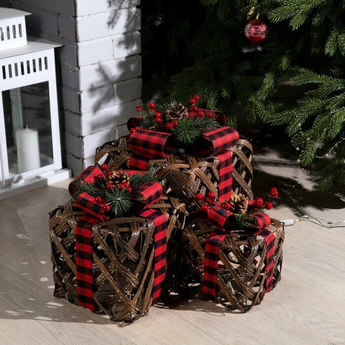 Светодиодная фигура "Коричневые плетёные подарки" 15, 20, 25 см, текстиль, металл, 220 В, свечение тёплое белое информация: