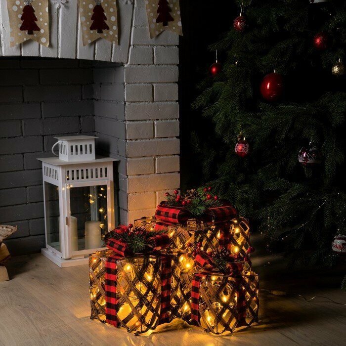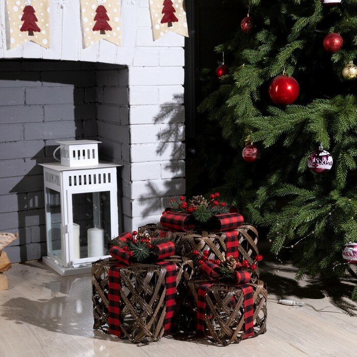 10 цен на Светодиодная фигура "Коричневые плетёные подарки" 15, 20, 25 см, текстиль, металл, 220 В, свечение тёплое белое