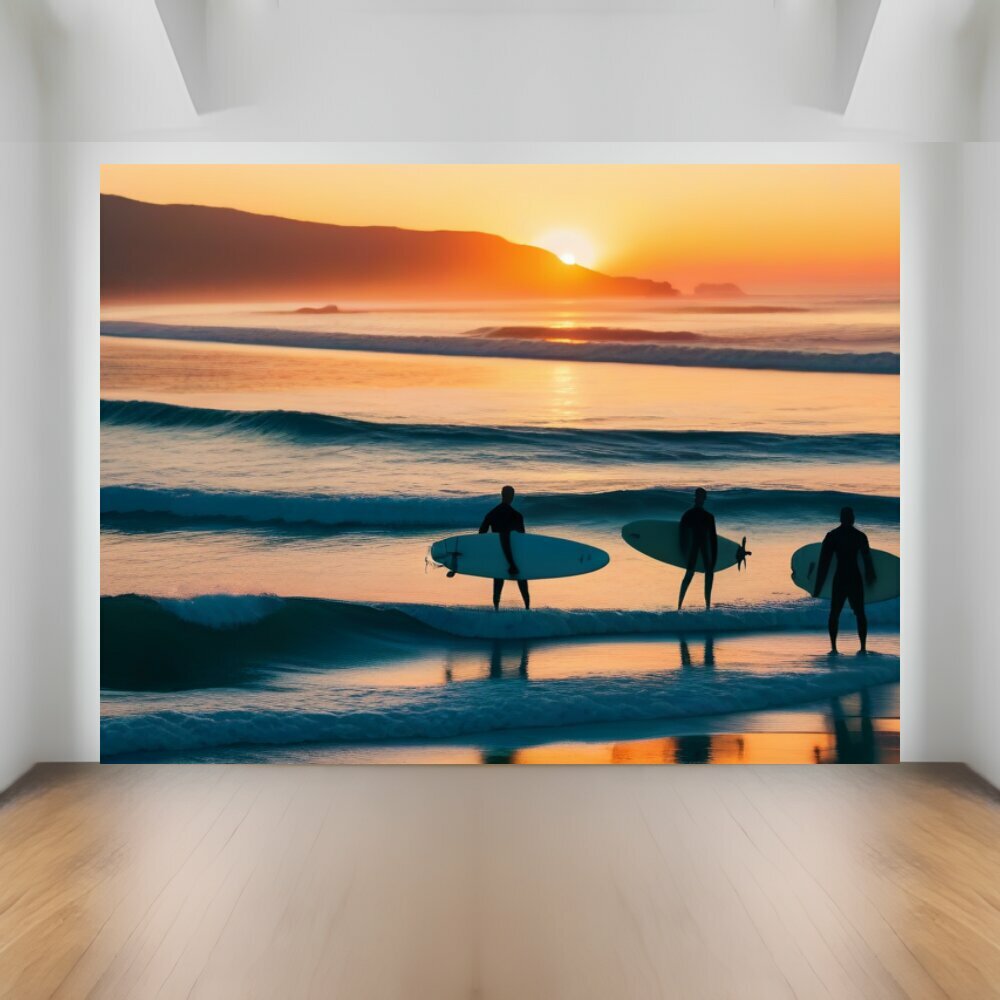 Фотообои моющиеся ударопрочные "Групповая фотография с серфингистами на фоне заката" 400x300 см. флизелиновые на стену 9 990 ₽