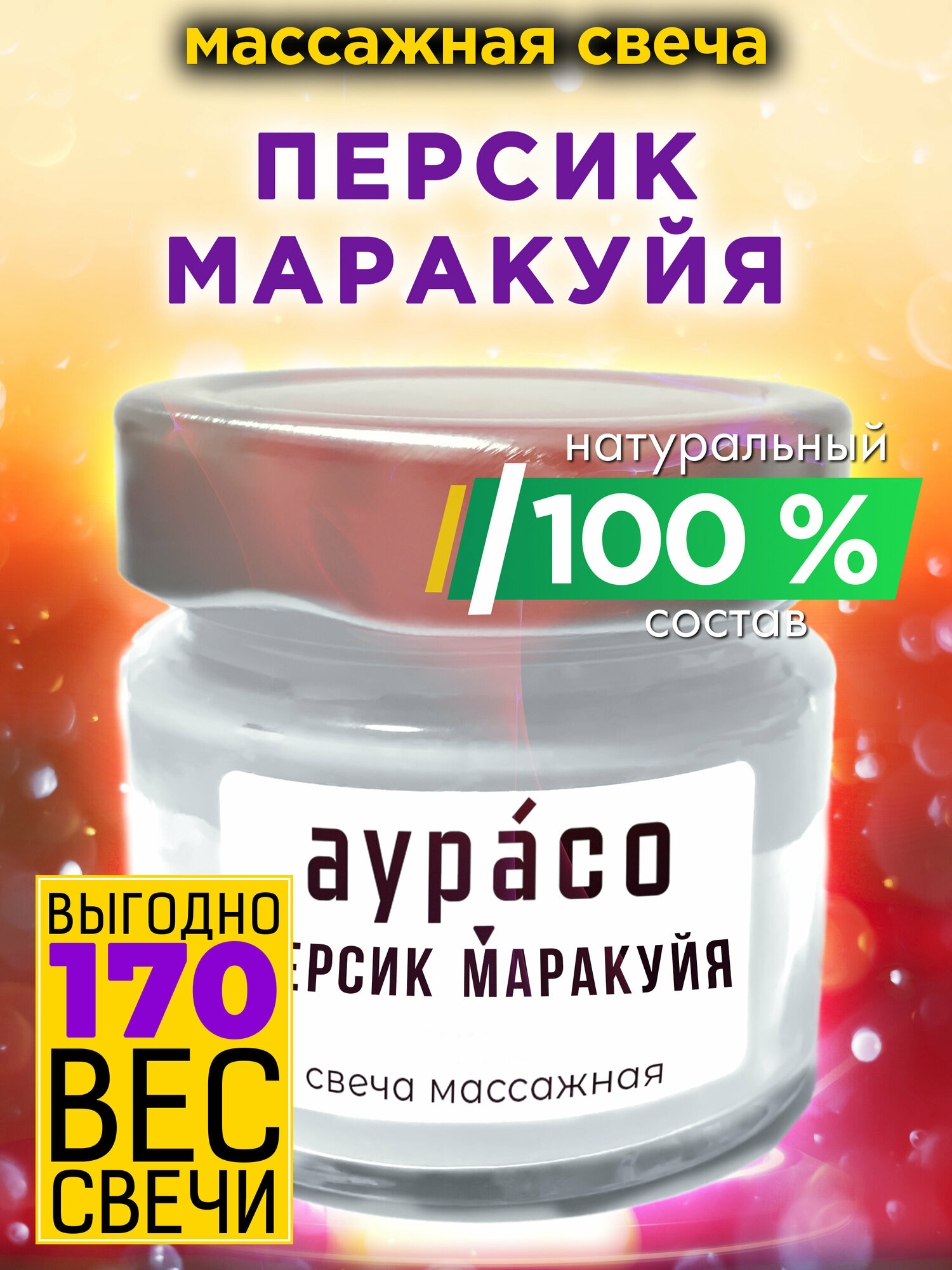10 цен на Персик маракуйя - натуральное массажное масло, ароматическая массажная свеча Аурасо из 100 % соевого воска, крем-свеча натуральная, 1 шт.
