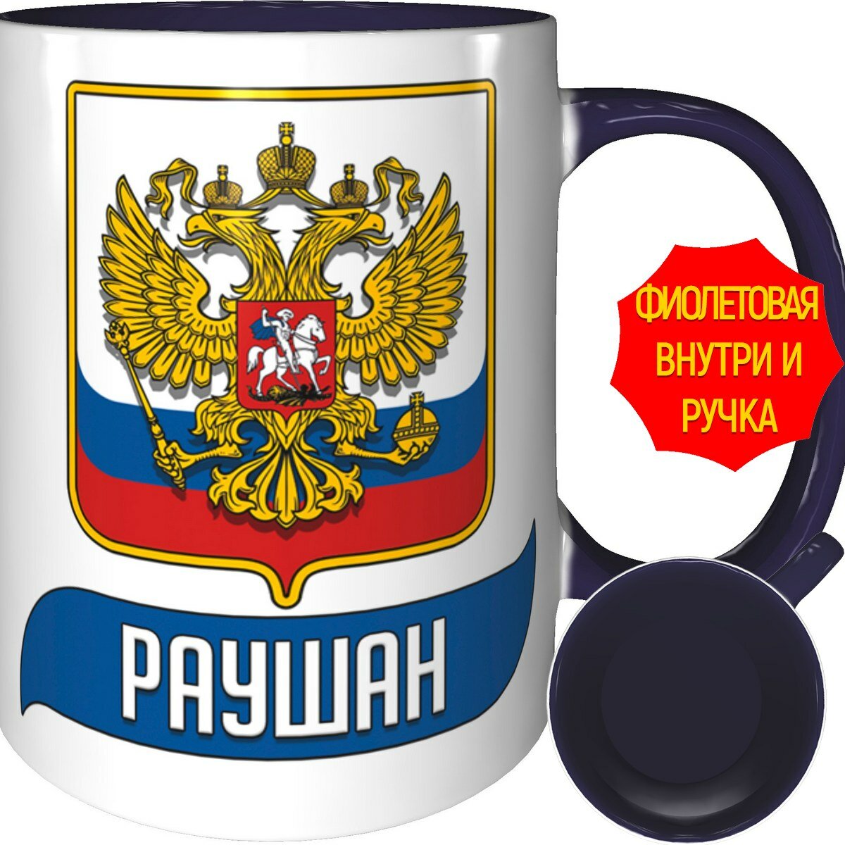 Кружка Раушан с Флагом и Гербом России - внутри и ручка фиолетовая информация: