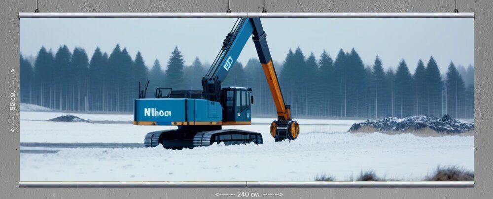 Картина на холсте "Кран, работающий в заснеженной местности" с подвесами 240х90 см. для интерьера на стену информация: