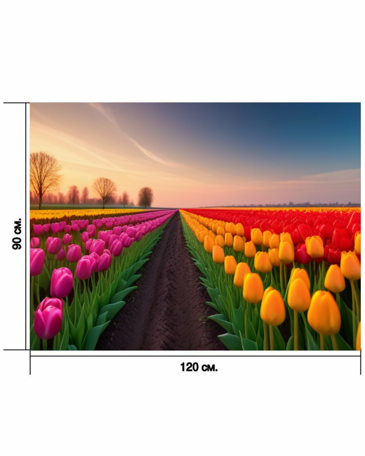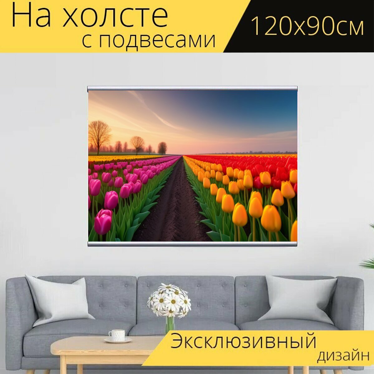 Картина на холсте "Ландшафт с тюльпанами и солнечным закатом" с подвесами 120х90 см. для интерьера на стену информация: