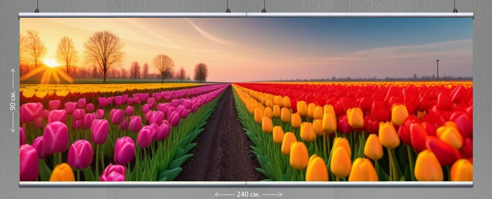 Картина на холсте "Ландшафт с тюльпанами и солнечным закатом" с подвесами 240х90 см. для интерьера на стену информация: