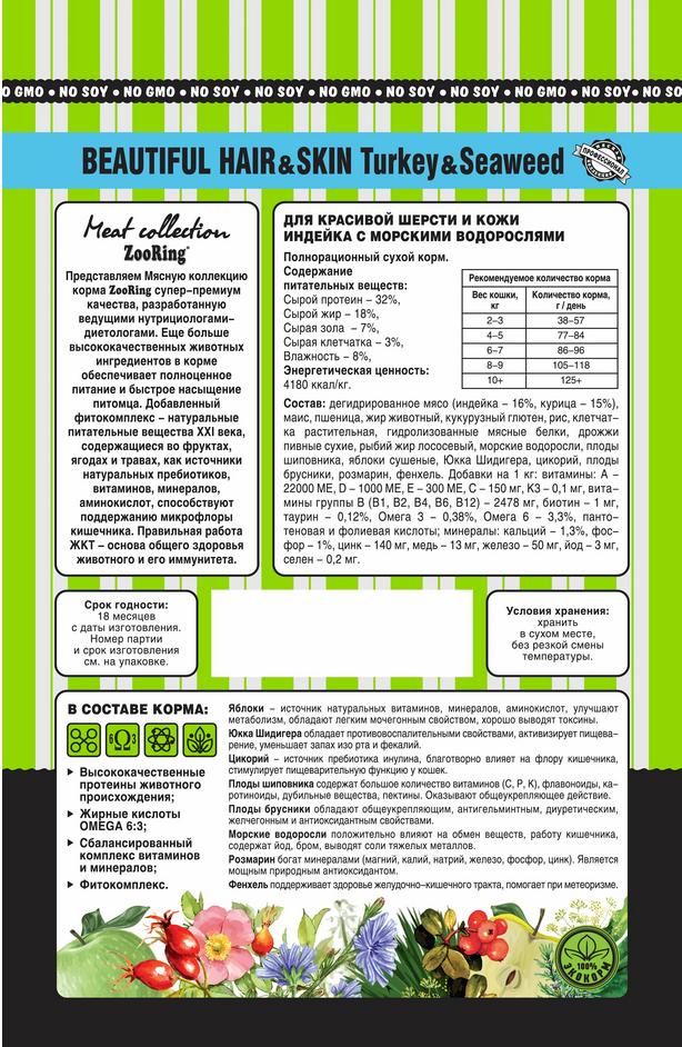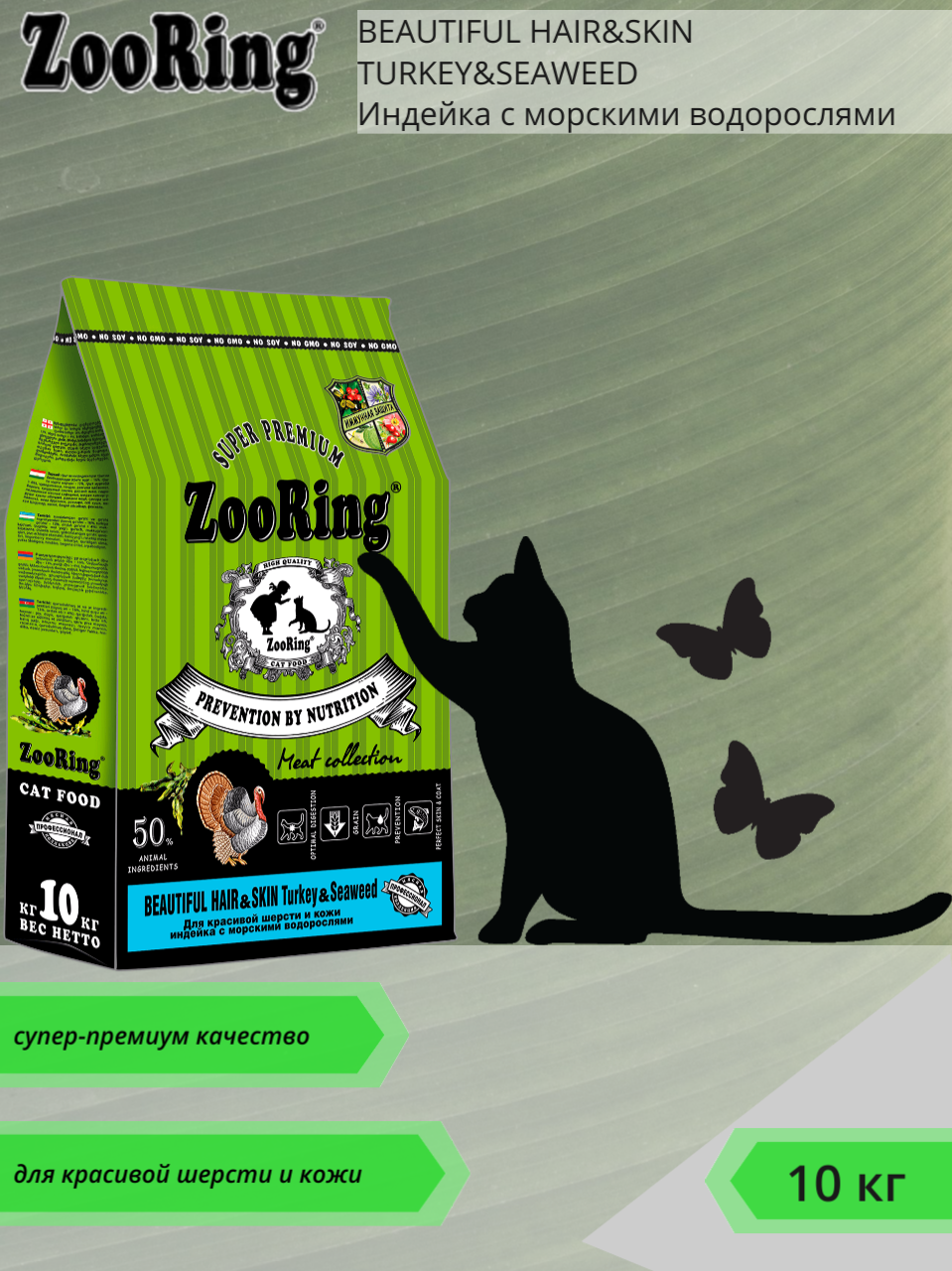 Сухой корм Зооринг / Zooring для кошек Beautiful Hair&Skin Turkey&Seaweed для красивой шерсти и кожи индейка с морскими водорослями, 10кг информация:
