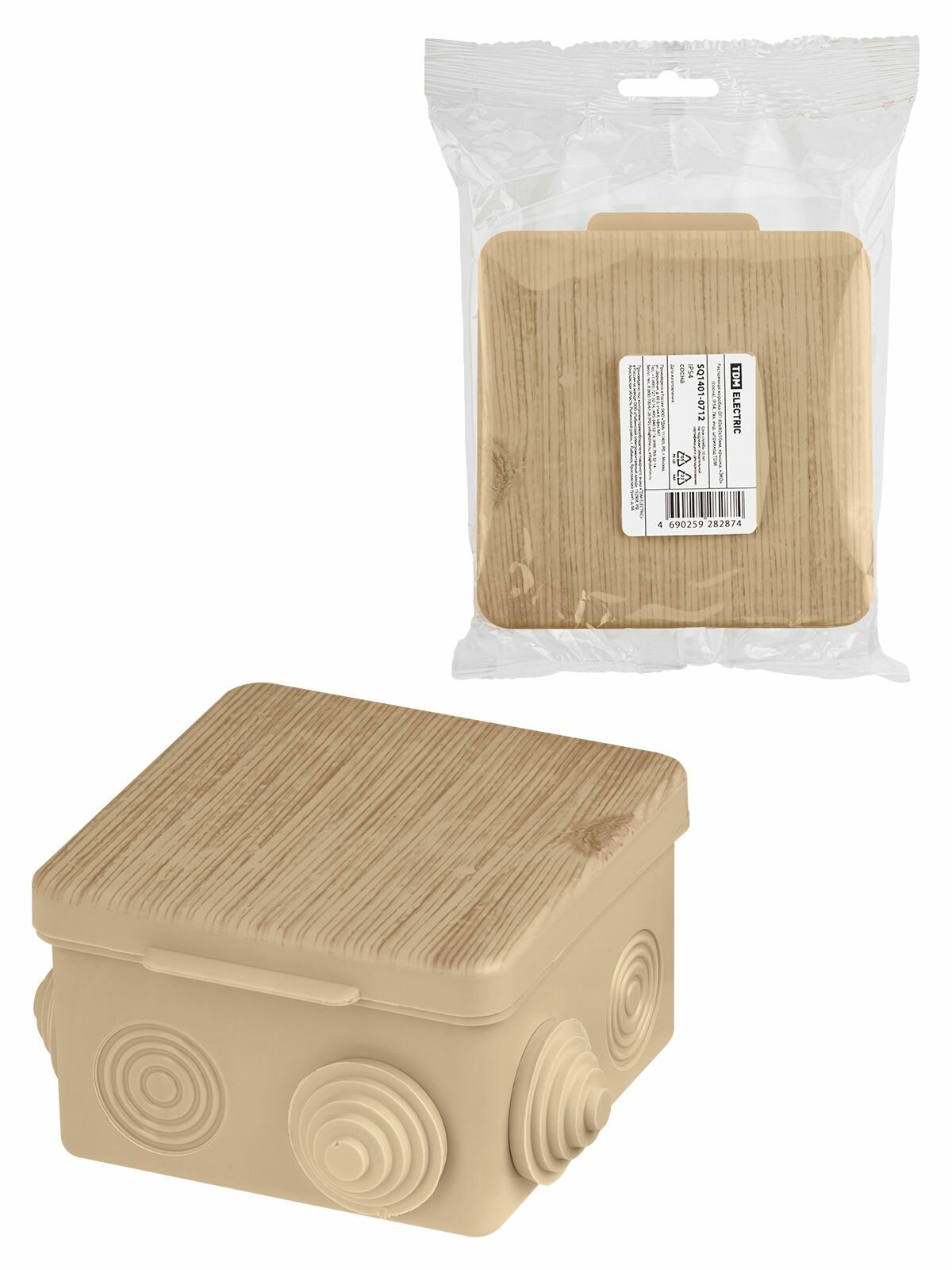 TDM Распаячная коробка ОП 80x80x50мм, крышка, ЭКО сосна, IP54, 7вх. инд. штрихкод SQ1401-0712