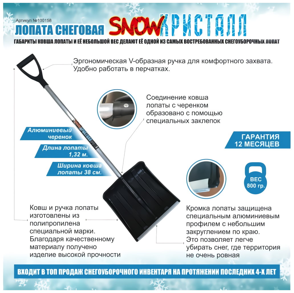 Лопата для уборки снега инструм агро 100158 SnowКристалл Снежинка с черенком, черный/серый