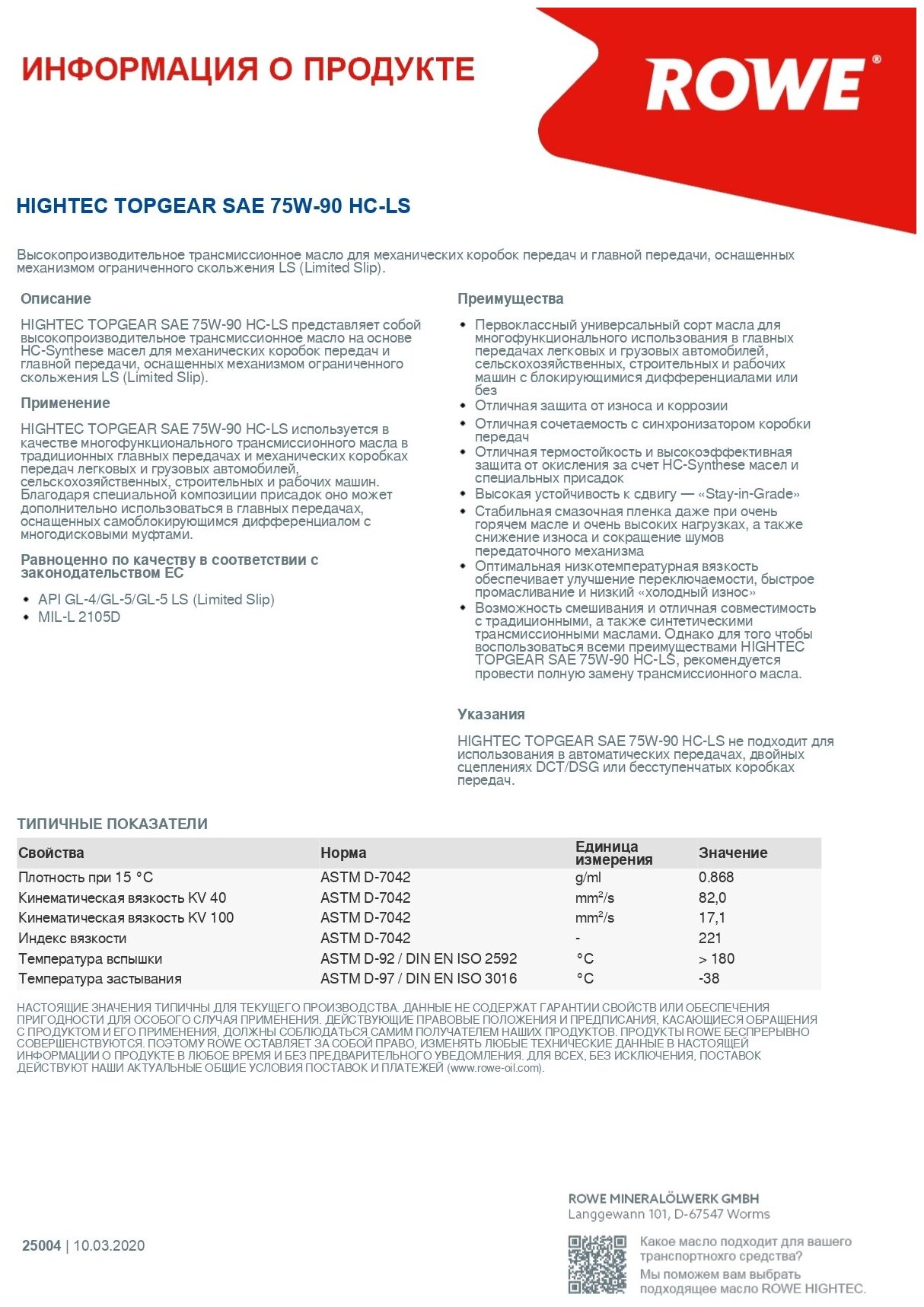 Трансмиссионное масло синтетическое ROWE HIGHTEC TOPGEAR HC-LS 75W90, 5 литров информация: