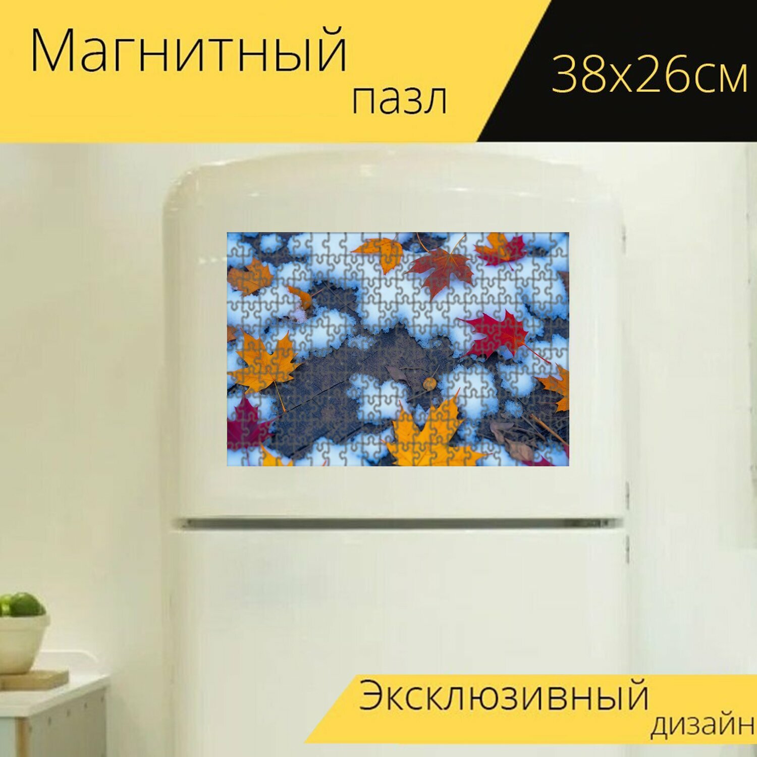 10 цен на Магнитный пазл "Ностальгическая зима: опавшие листья под снегом" для интерьера, 38х26 см.