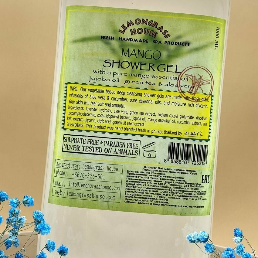 Гель для душа "Манго" 1л. от Lemongrass House (Таиланд) Безсульфатный натуральный гель, увлажняющий, с тропическим фруктовым ароматом, с эфирными маслами. информация: