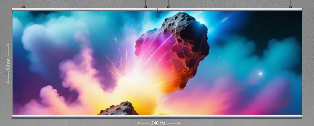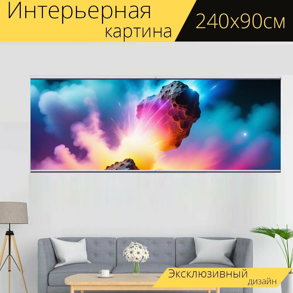 Картина на холсте "Легкие метеориты сквозь красочный туман в космосе" с подвесами 240х90 см. для интерьера на стену информация: