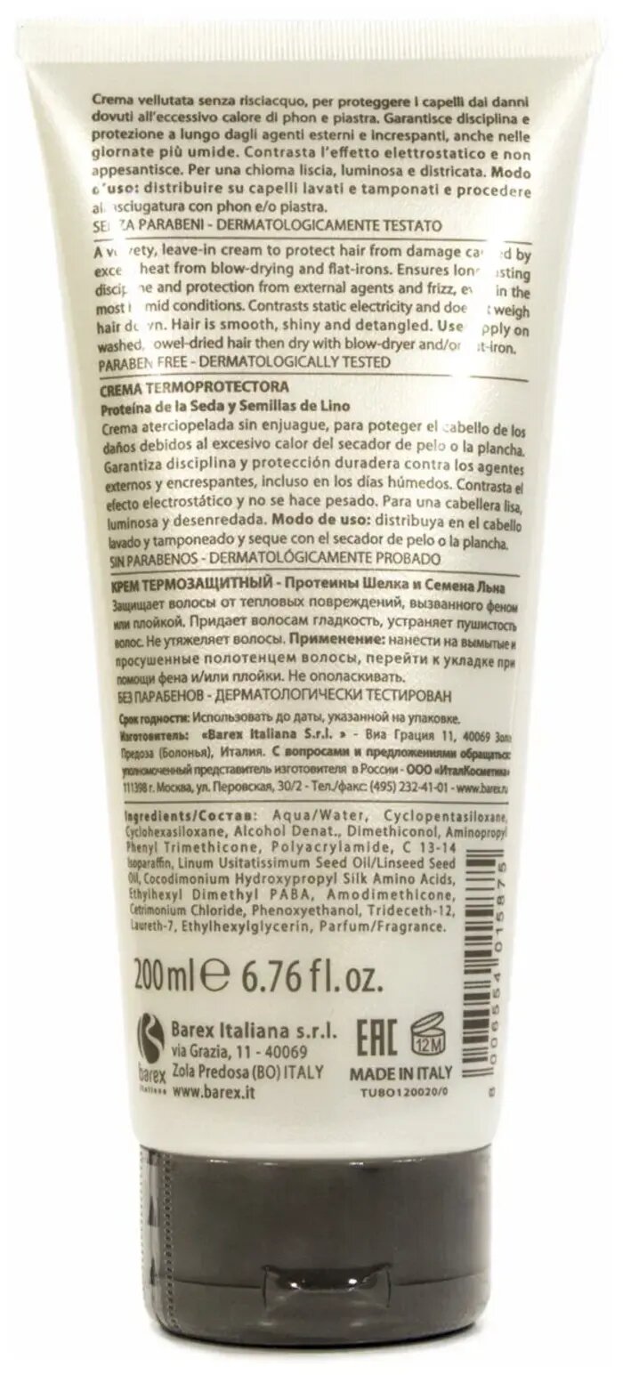 Крем термозащитный Barex Olioseta Oro Di Luce с протеинами шелка и семенем льна 200 мл (120020) информация: