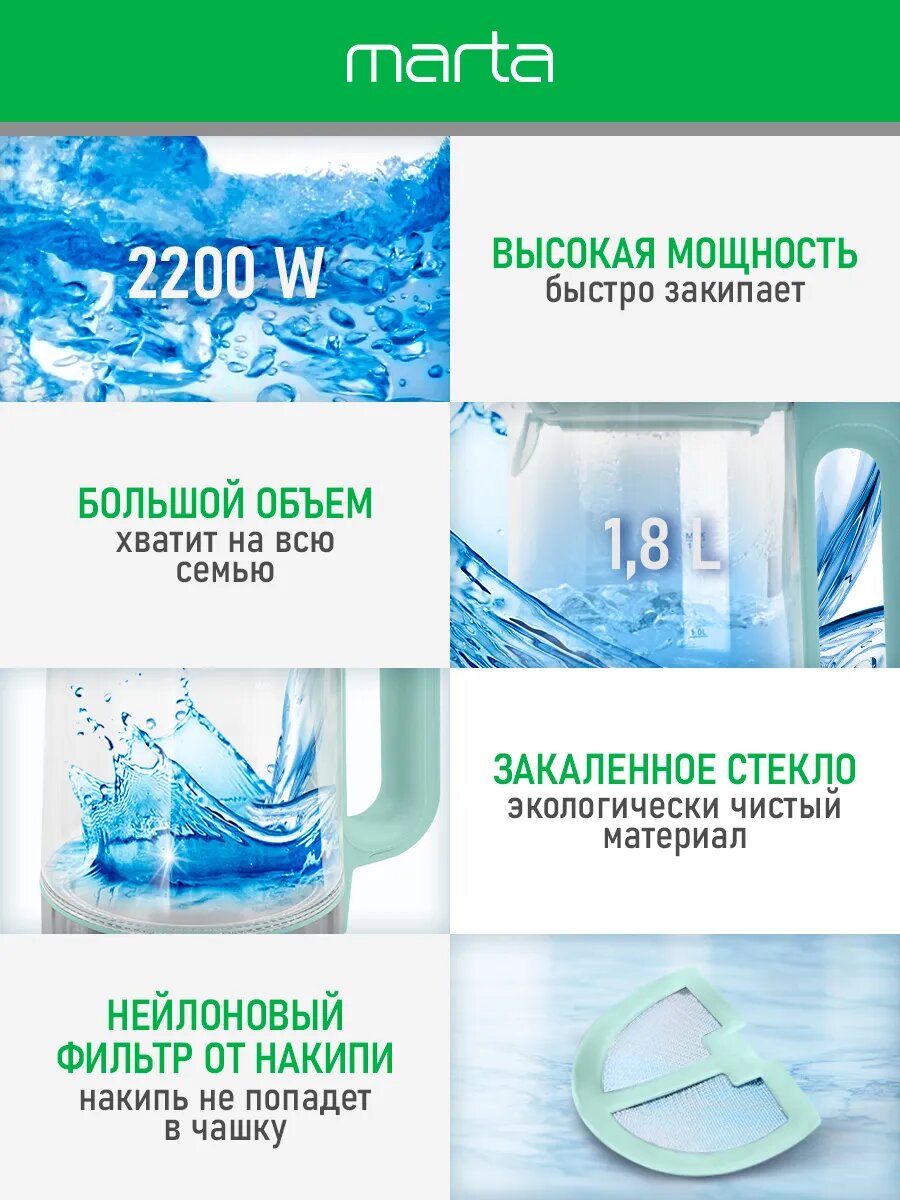 Электрический чайник MARTA MT-4610 белый стеклянный с подсветкой, 1,8 л