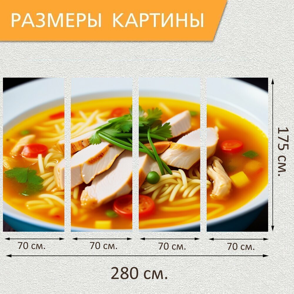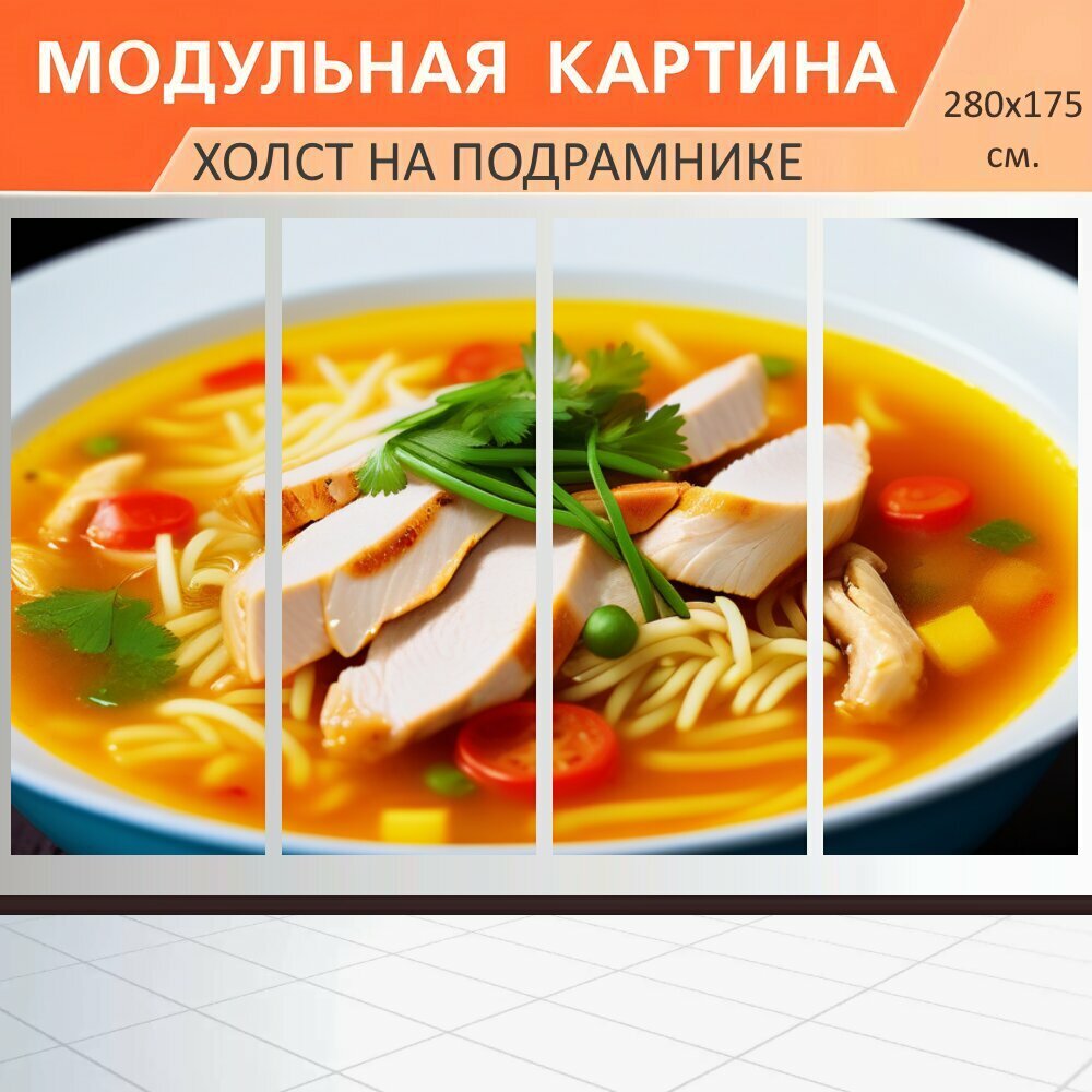 10 цен на Модульная картина на холсте в кафе "Суп с лапшой и курицей , " триптих на подрамнике 280х175 см. для интерьера