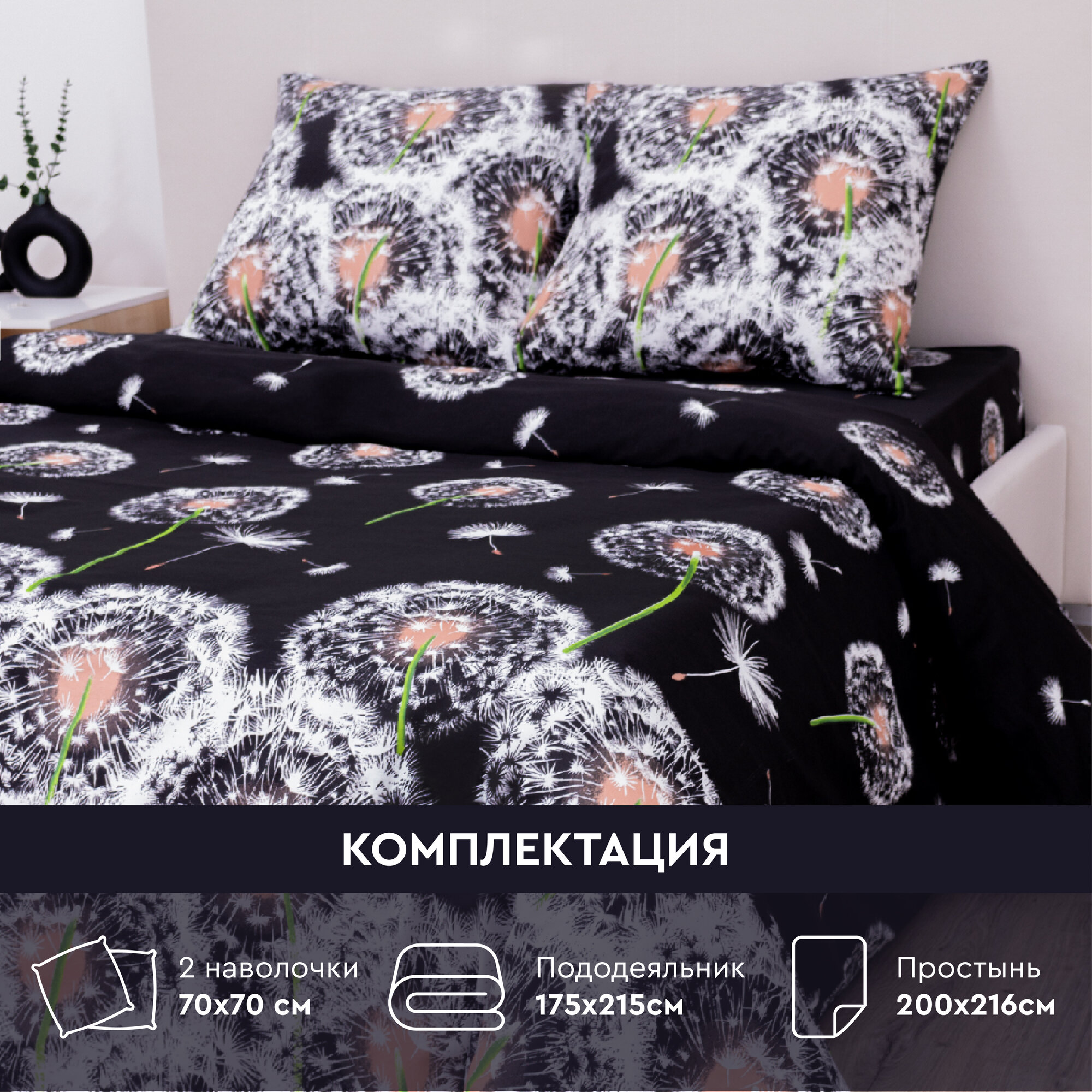 Постельное белье Василиса Белые одуванчики, бязь, евростандарт, черный/белый