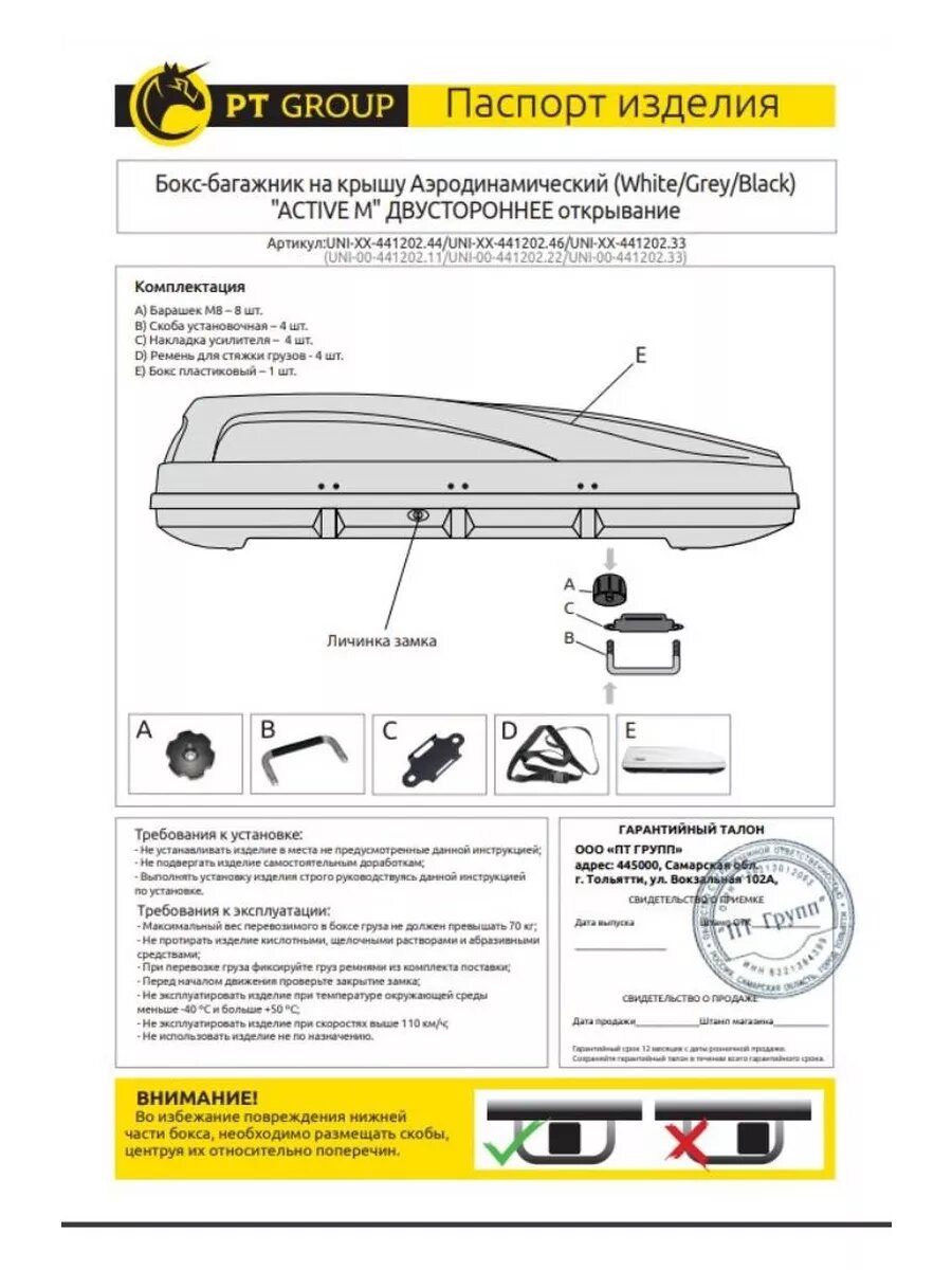 Багажный бокс на крышу ПТ-Групп Актив М (PT Group ACTIVE M), 450 л аэродинамический (белый, двустороннее открывание) Арт. 2519