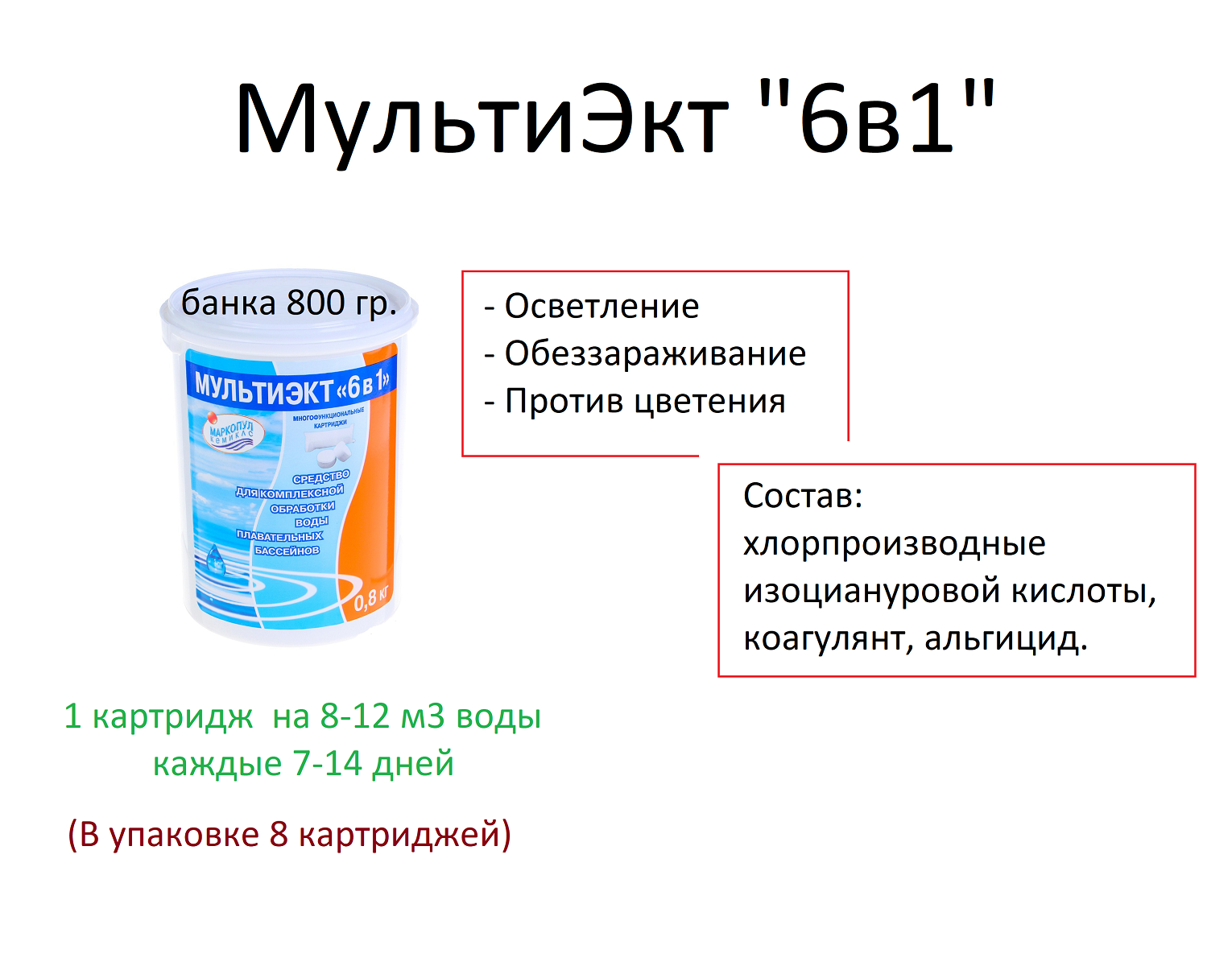 Химия для бассейна (маркопул кемиклс мультиэкт 6в1 картриджи, 0.8кг ( 12 шт) ХИМ18)
