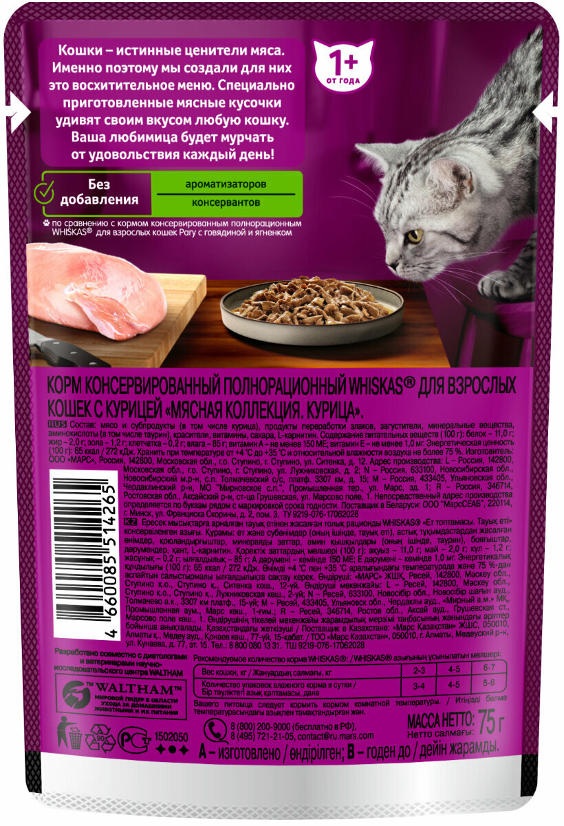 Whiskas Влажный корм «Мясная коллекция» для кошек, с курицей, 75г 1023330110244945, 0,075 кг, 53682