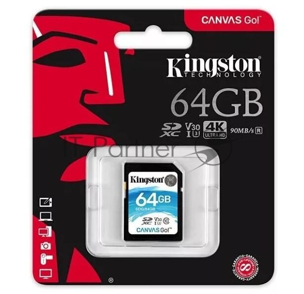 Карта памяти Kingston Canvas Go Plus, SDXC, 64 гб, UHS-I U3, 170 Мб/с, класс 10 (SDG3/64GB)
