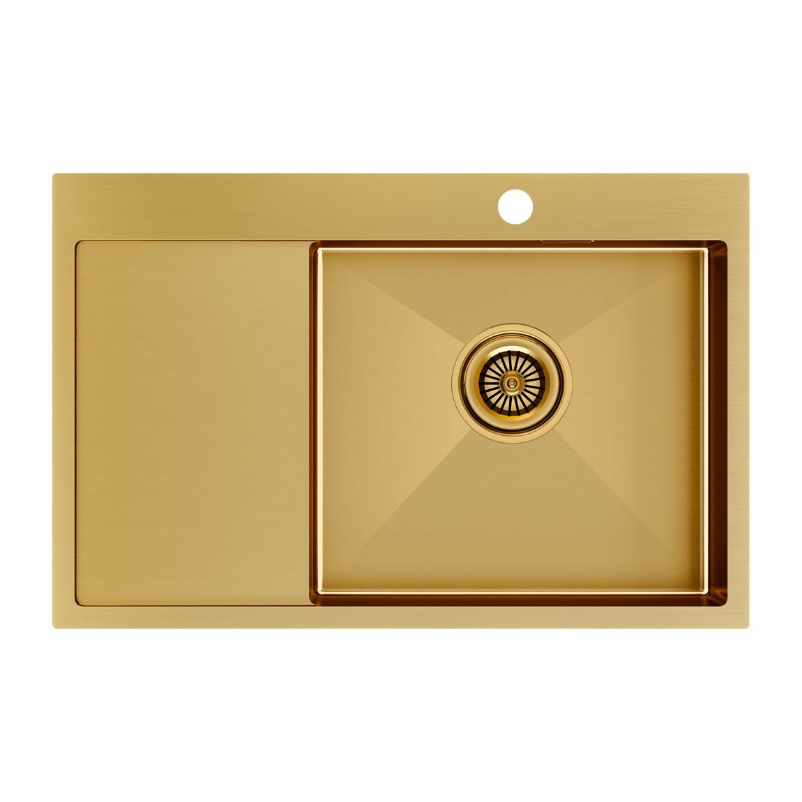 10 цен на Мойка для кухни из нержавеющей стали Paulmark KRONER 78F, 780х510 мм, мойка справа, PVD покрытие, врезная / вровень со столешницей, цвет брашированное золото