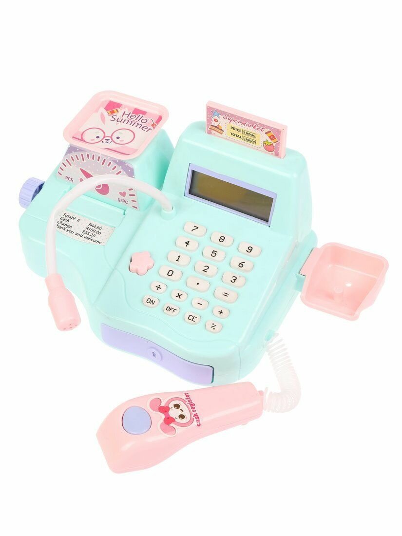 Касса детская игрушечная с калькулятором, сканером и микрофоном, игрушечные деньги и набор игрушечных продуктов в комплекте