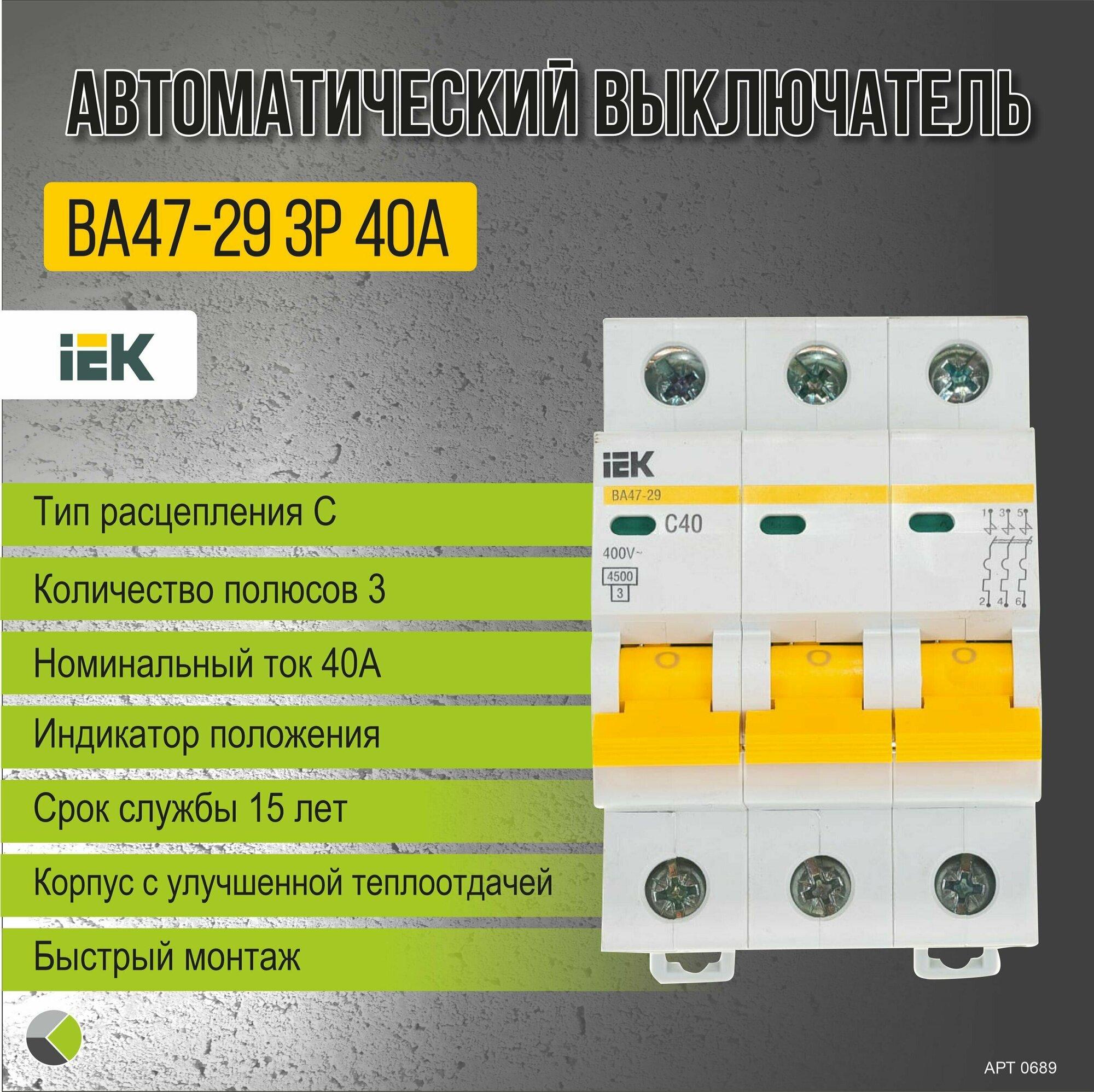 Автоматический выключатель IEK KARAT ВА47-29 3Р 40А 4,5кА х-ка С информация: