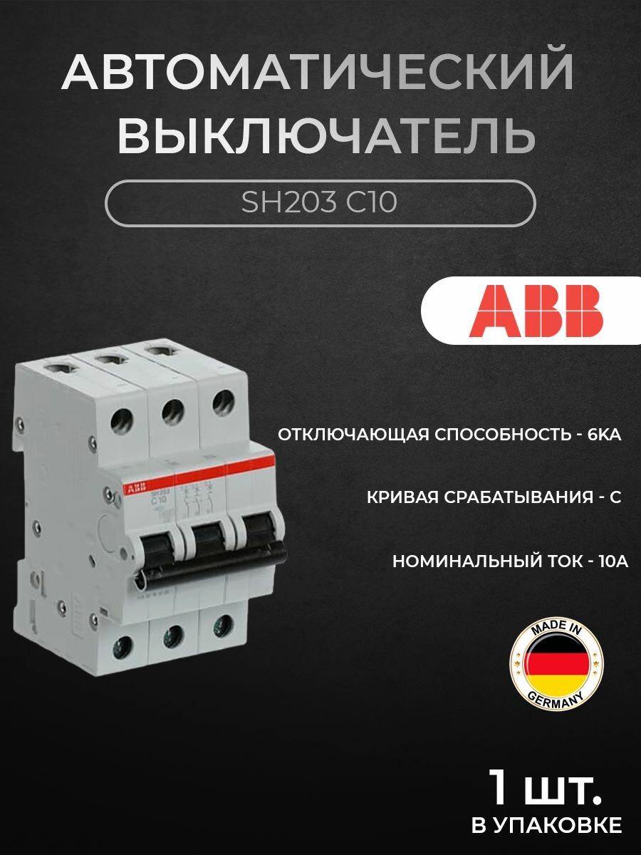 Автоматический выключатель ABB SH203 C10, 3-полюсный, 10А, 6kA, характеристика C (2CDS213001R0104)
