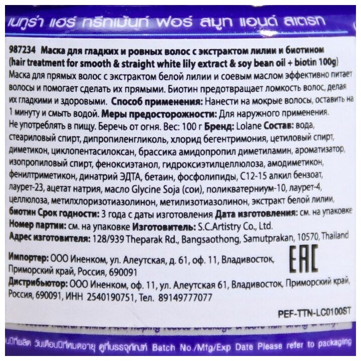 LOLANE Маска для волос с экстрактом Белой Лилии, 100 мл информация: