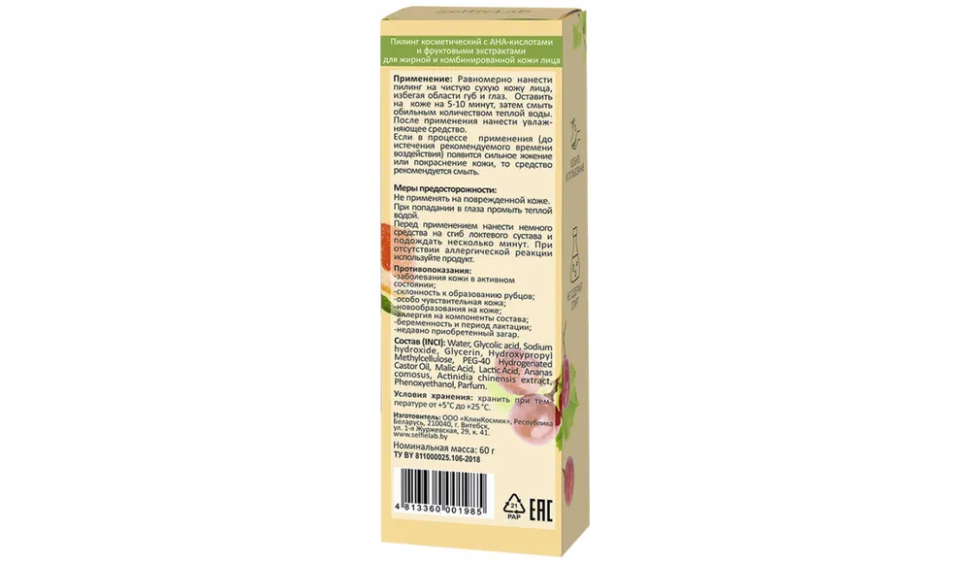 Пилинг косметический SelfieLab с АНА-кислотами и фруктовыми экстрактами для жирной и комбинированной кожи лица, 60 мл