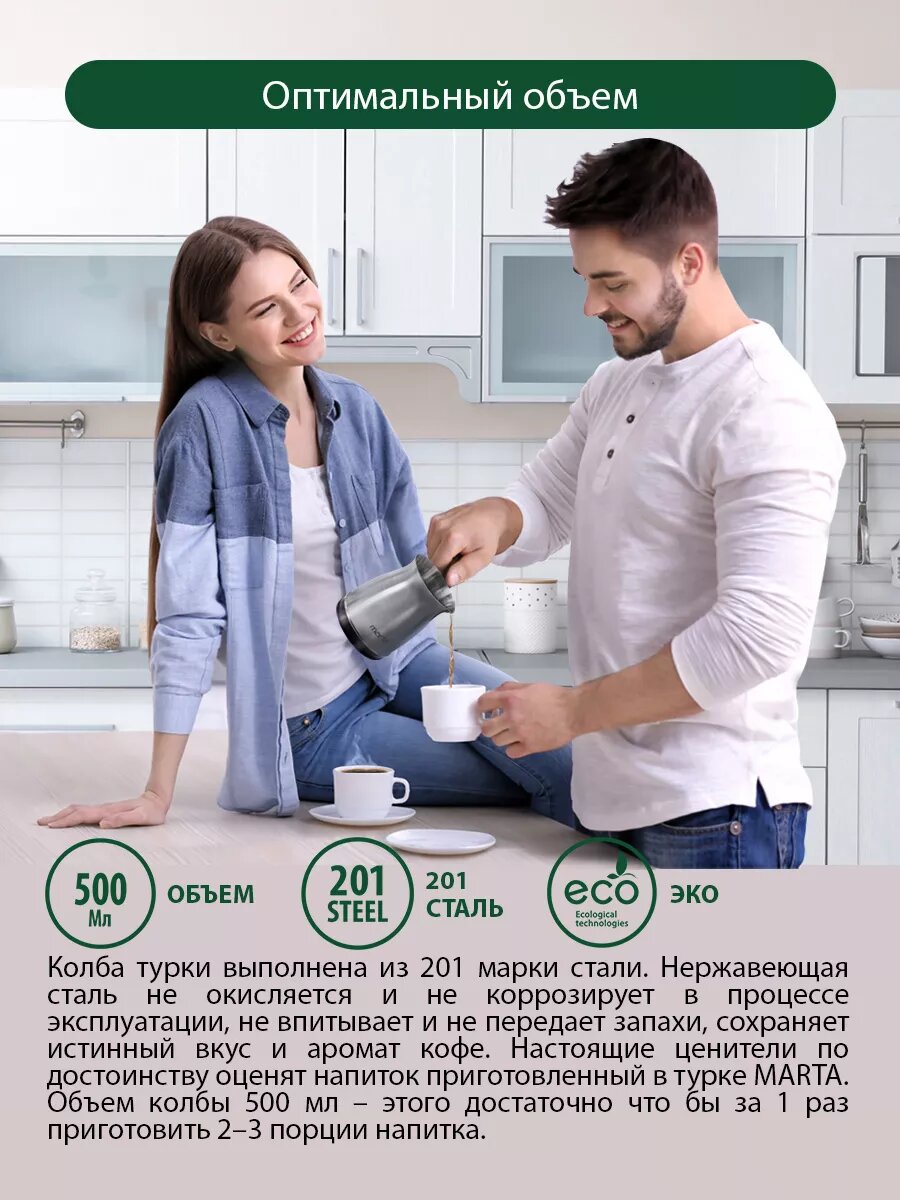 Турка для кофе электрическая Марта MT-2142 с теплоизоляционной ручкой колба из нержавеющей стали бордовый гранат/серебристый объем 500мл мощность