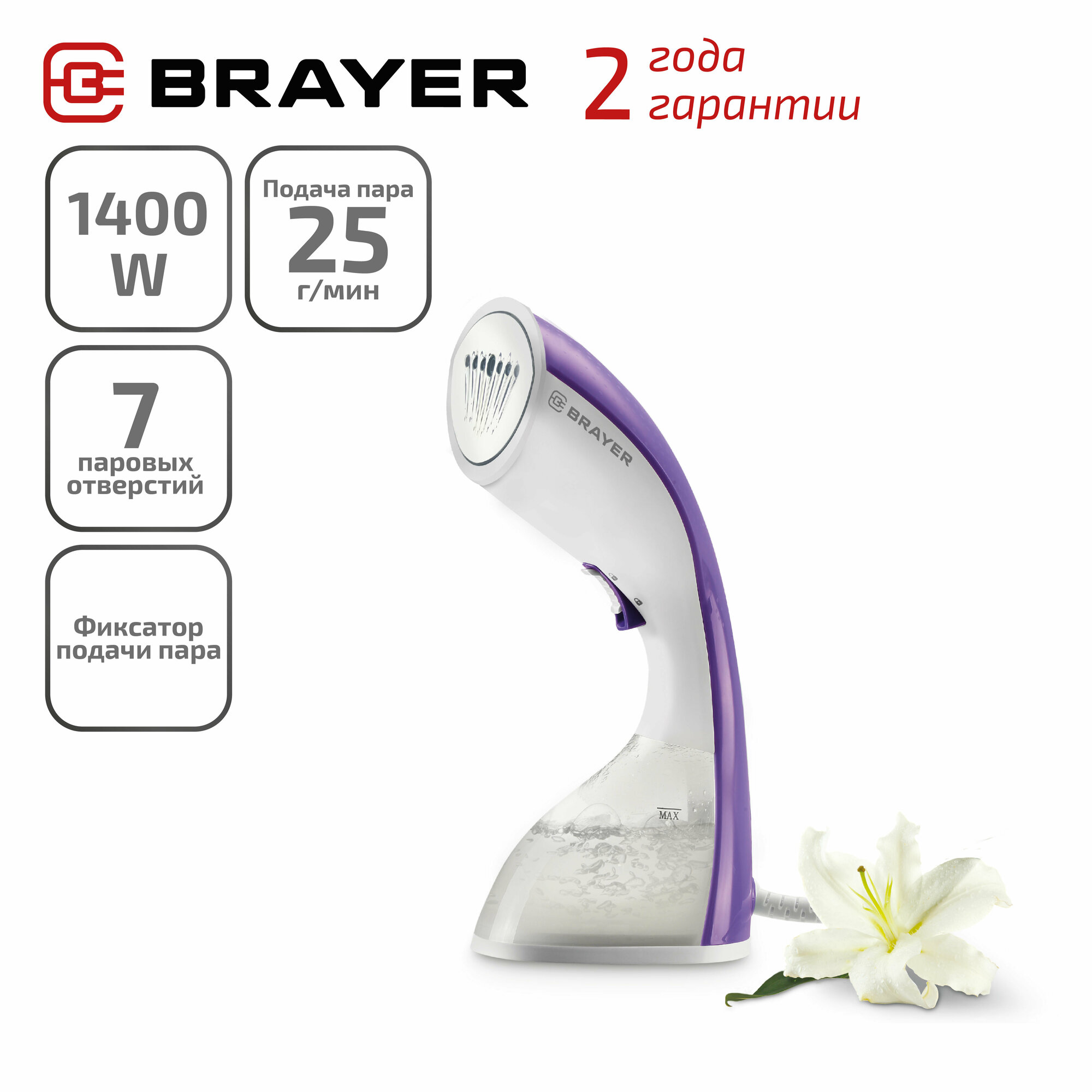 BRAYER Утюг 4120BR Отпариватель ручной, 1400 Вт, 25 г мин, белый фиолетовый информация: