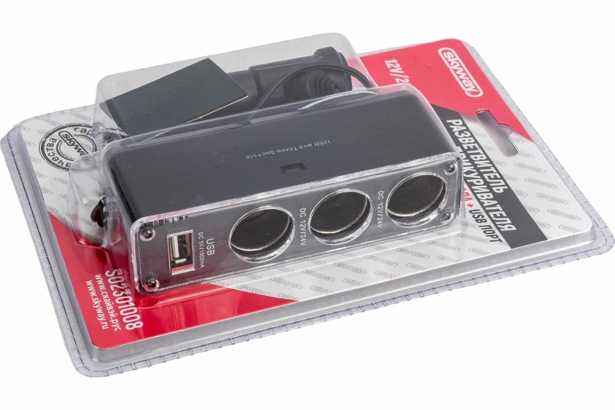Прикуриватель 3 гнезда 12 В 5 А USB с проводом черный Skyway SKYWAY SW-1913/S02301008 | цена за 1 шт