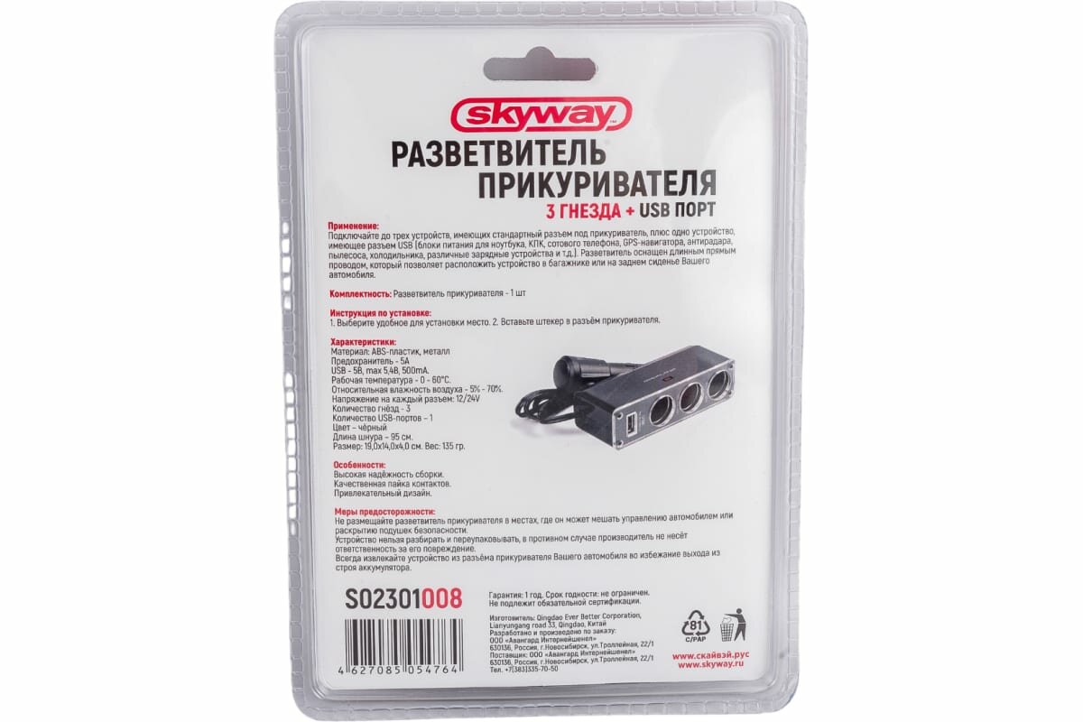 SKYWAY S02301008 Разветвитель прикуривателя на 3 гнезда и 1 USB (с пров.) SKYWAY Черный предох 5А (S02301008) информация: