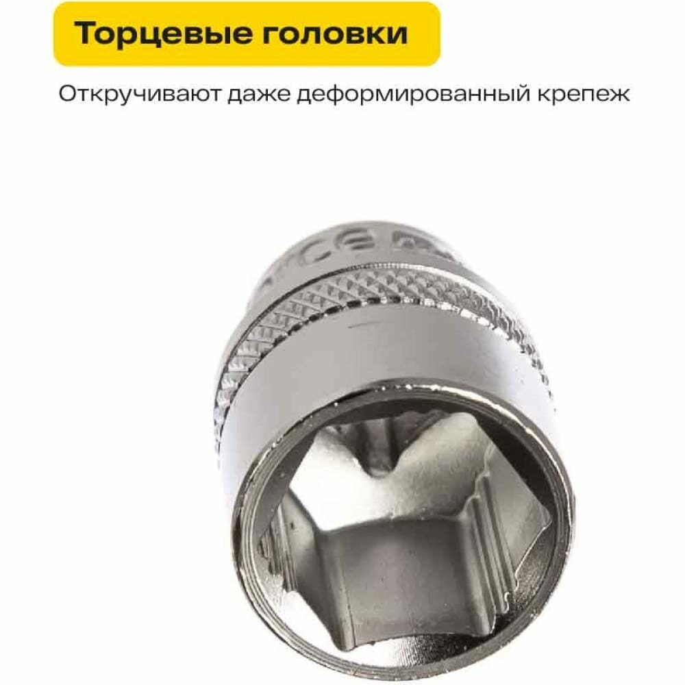| Головки торцевые подробно | 1/4": 4; 4,5; 5; 5,5; 6; 7; 8; 9; 10; 11; 12; 13 мм.; 1/2": 8; 9; 10; 11; 12; 13; 14; 15; 16; 17; 18; 19; 21; 22; 24; 27; 30; 32 мм.; 1/4" удлиненные торцевые головки – 7; 8; 10; 12; 13 мм; 1/2" удлиненные торцевые головки – 10; 12; 13; 14; 15; 17; 19 мм; 1/4" головки Е-типа – Е4; Е5; Е6; Е7; Е8; 1/2" головки Е-типа – Е10; Е12; Е14; Е16; Е18; Е20; Е22; Е24; 1/2" свечные головки с магнитом – 16 и 21 мм |