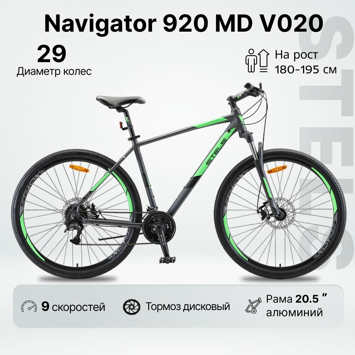 Велосипед Горный STELS Navigator-920 MD 29", рама 20,5" Антрацитовый/зеленый информация: