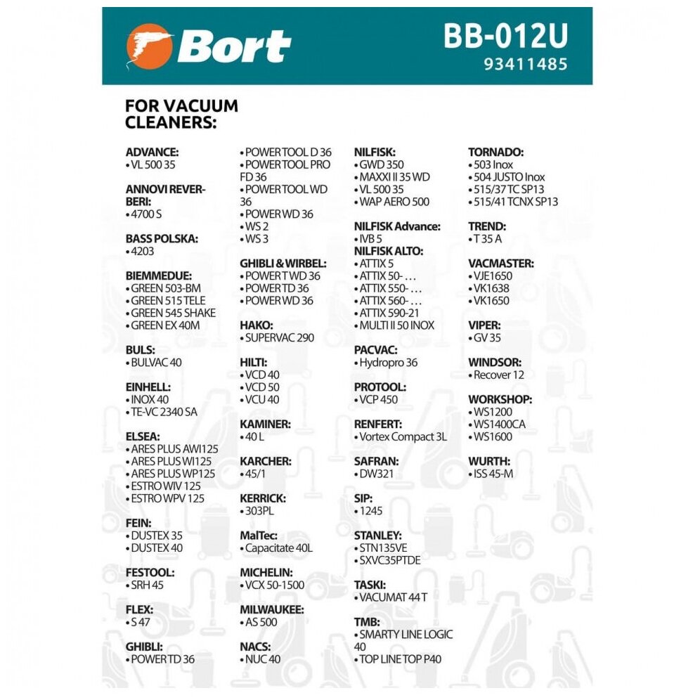 Мешки для пылесосов BORT, CHIBLI & WIRBEL, KARCHER NT (BB-012U) 5 шт информация: