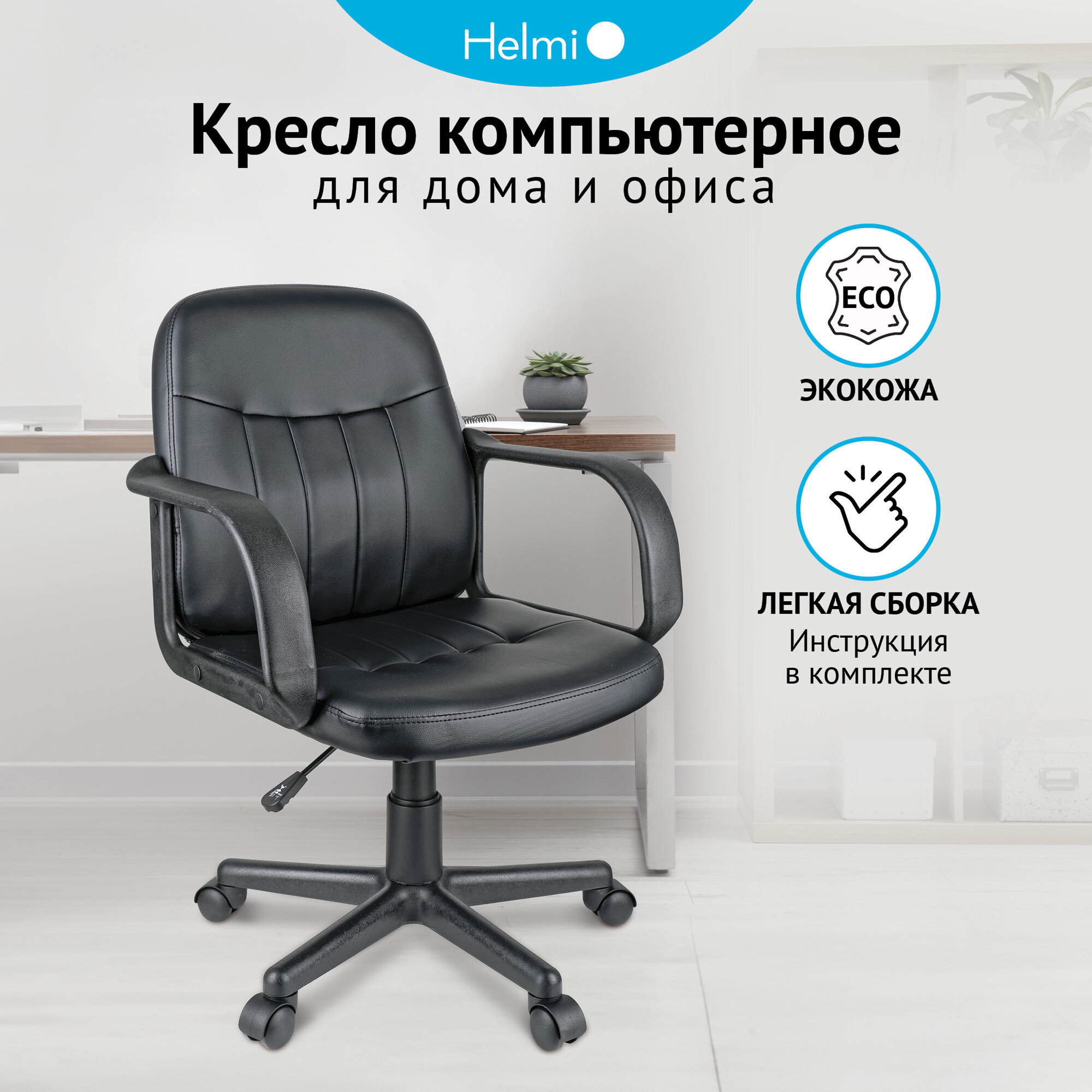 Компьютерное кресло Helmi HL-M01 "Brief"/Сиденье и спинка из черной экокожи, с подлокотниками, на колесиках, с регулировкой по высоте /Офисный компьютерный стул, мебель для дома информация: