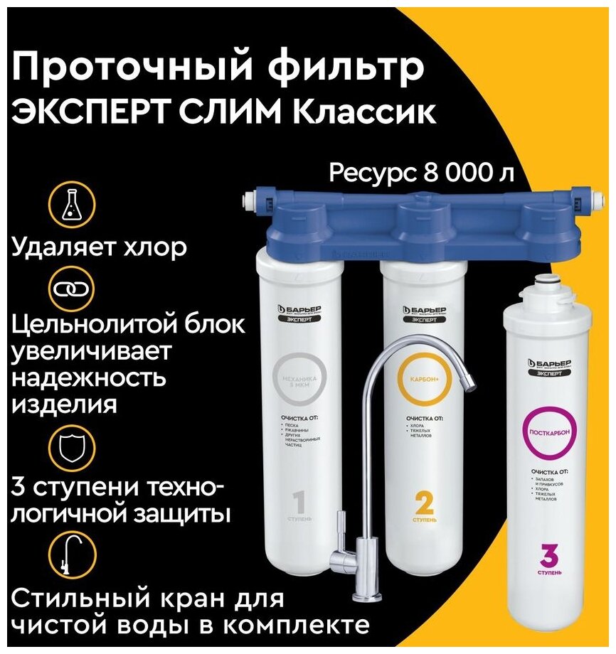 БАРЬЕР эксперт слим Классик, фильтр под мойку для очистки воды, очищает воду от хлора и вредных примесей, трехступенчатый, быстросъемный