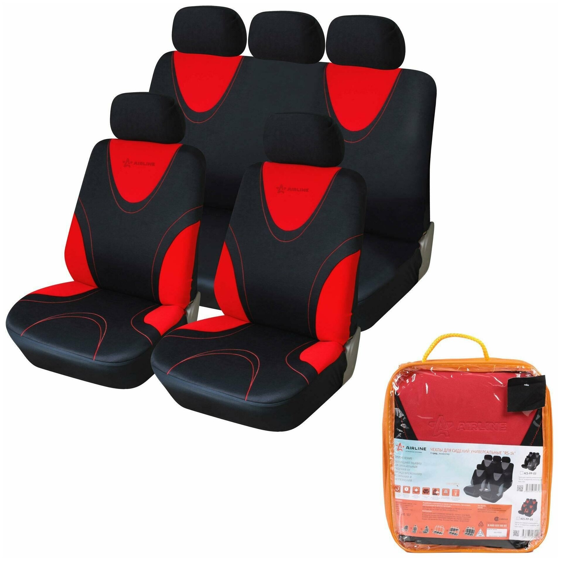 Чехлы для сидений универсал. RS-1k, передн./задн.(9 предм.), полиэстер, черн./красн. (ACS-PP-05) AIRLINE ACS-PP-05 | цена за 1 шт