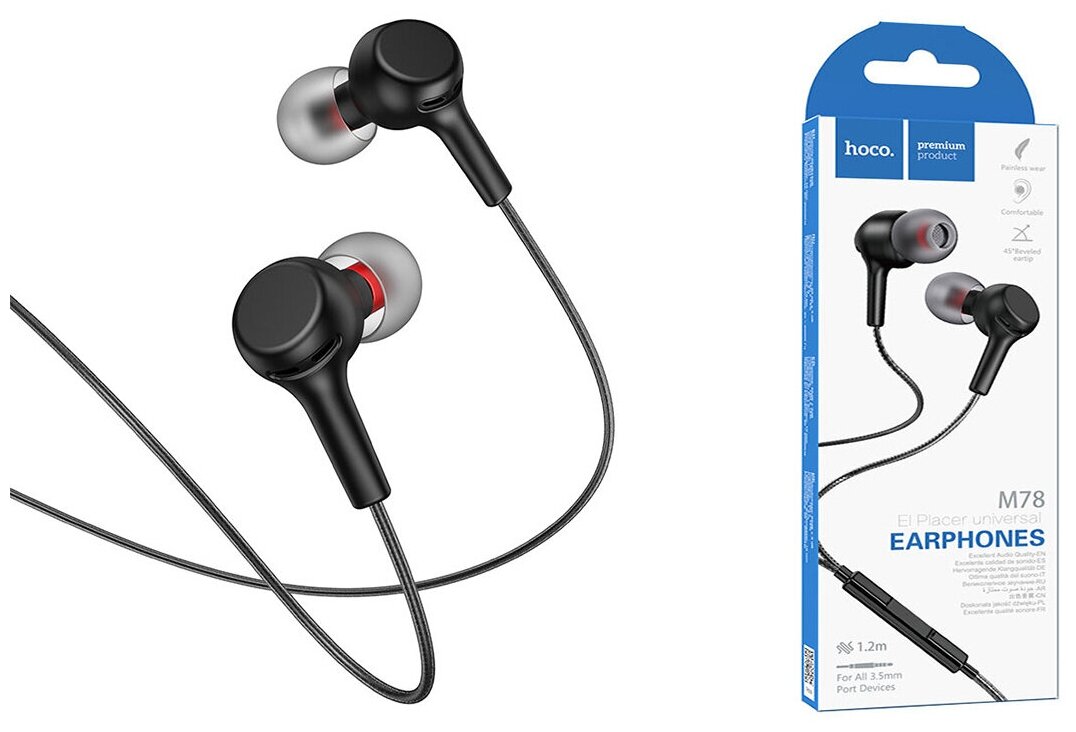 Наушники Hoco M78, проводные, вакуумные, микрофон, Jack 3.5 мм, 1.2 м, черные