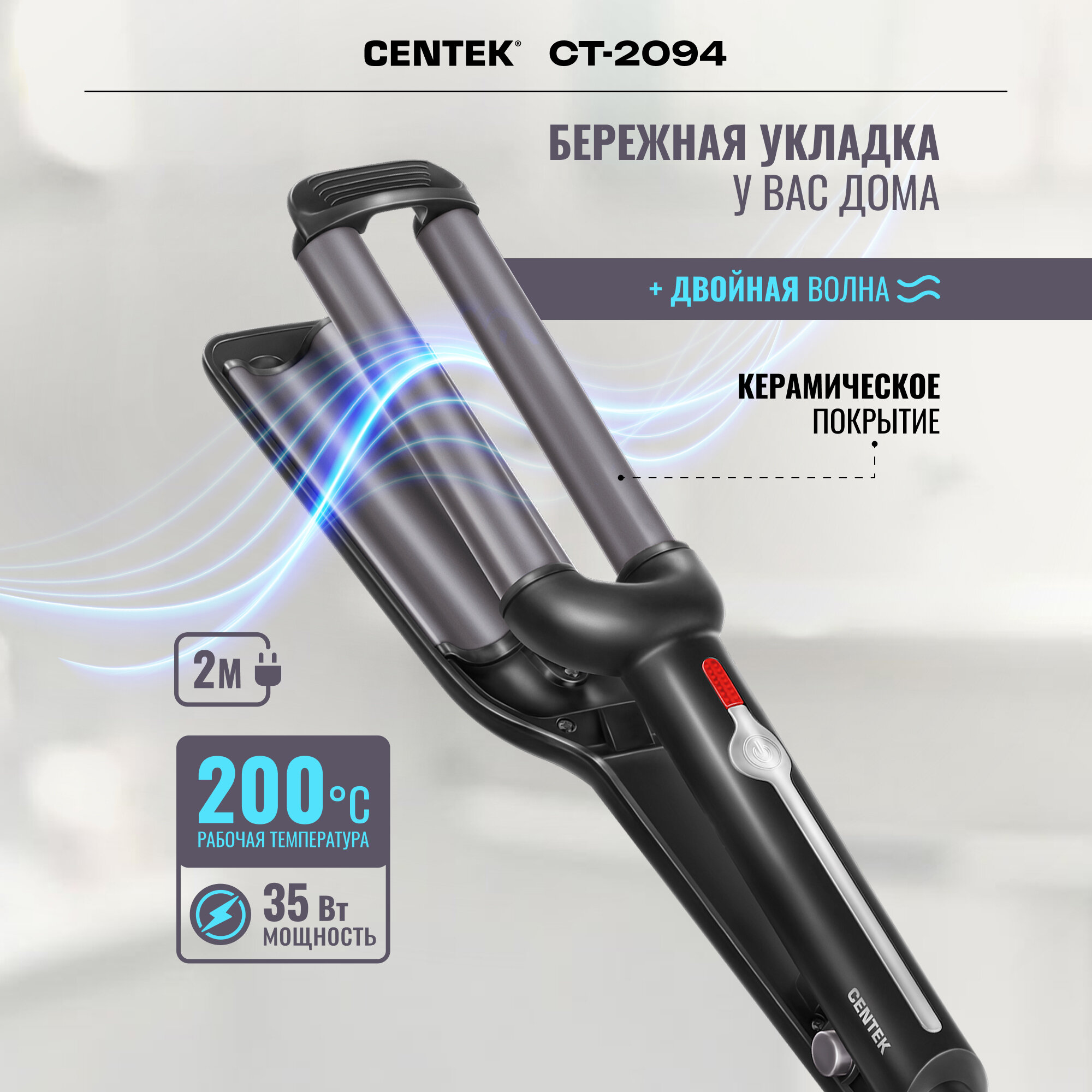 Отзывы на Стайлер для волос CENTEK CT-2094: 35 Вт/ двойная волна/ керамическое покрытие/ быстрый нагрев