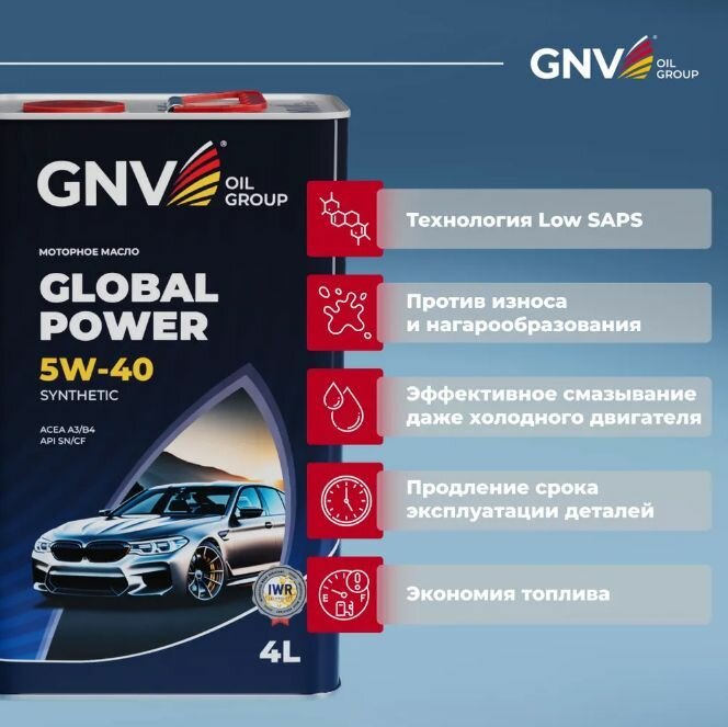 Синтетическое моторное масло GNV Global Power 5W-40 Synthetic A3/b4, 4 л GGP1011072016540540004 .