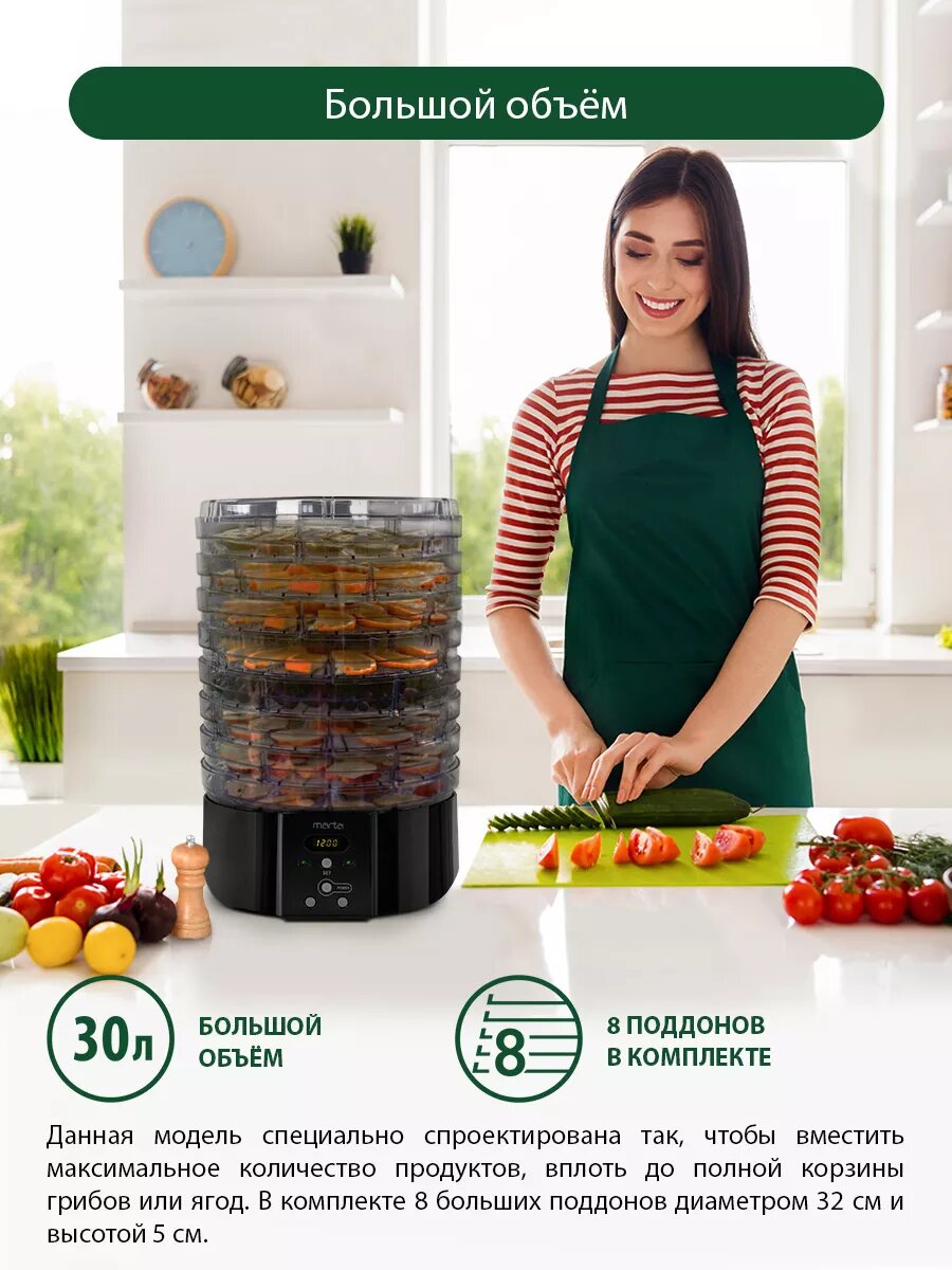 Дегидратор сушилка для овощей электросушилка MARTA MT-FD1889C 8 поддонов (6 основных + 1 для пастилы + 1 для ягод) черный жемчуг