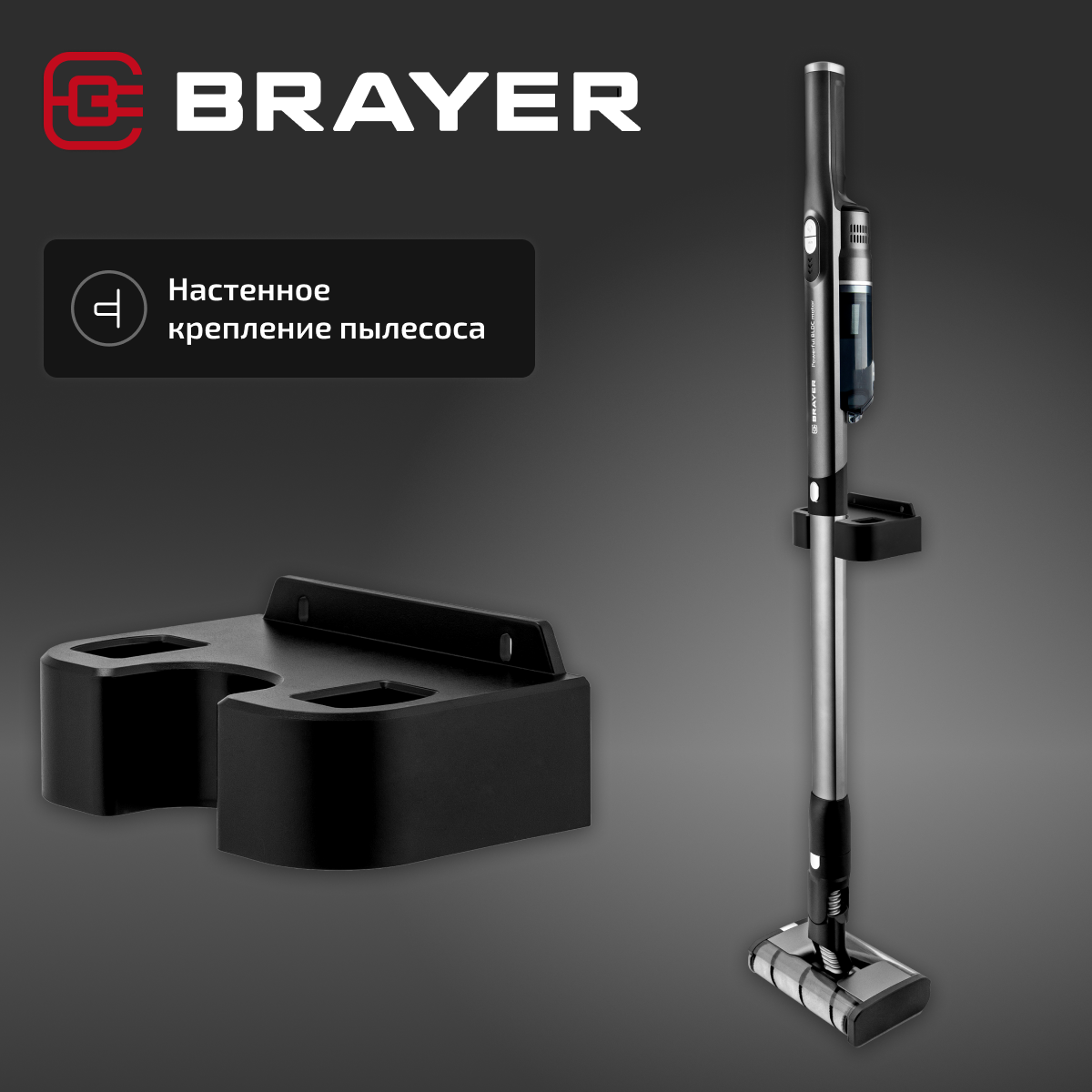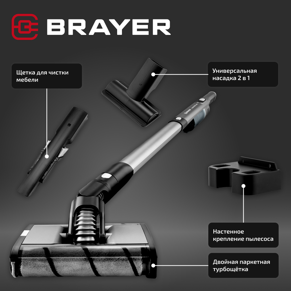 Вертикальный пылесос BRAYER BR4262, 2в1, 200Вт, BLDC мотор, контейнер 1л, батарея 22.2 В, Li-Ion 2200 мА/ч, турбощетка с LED, база д/хранения